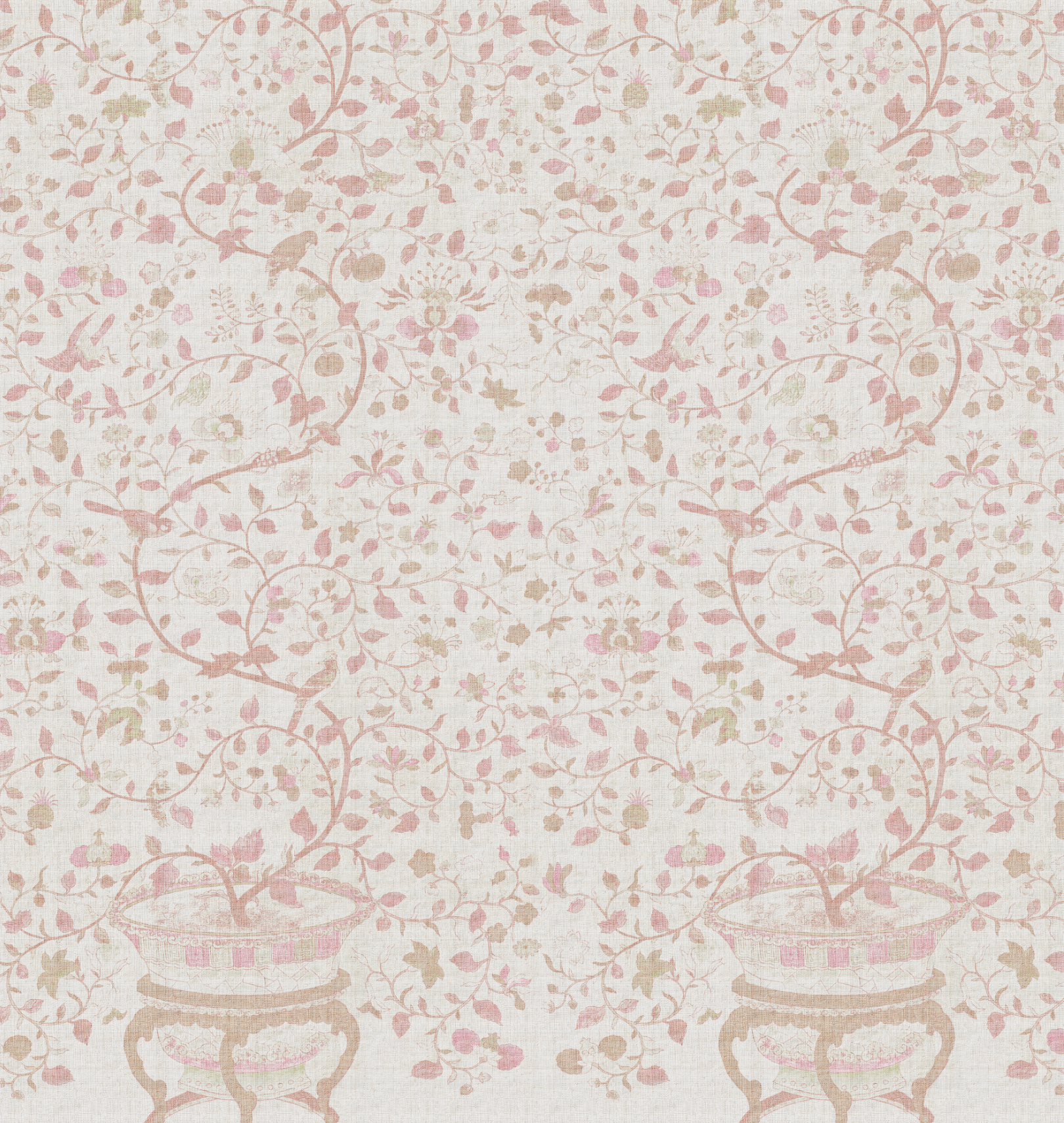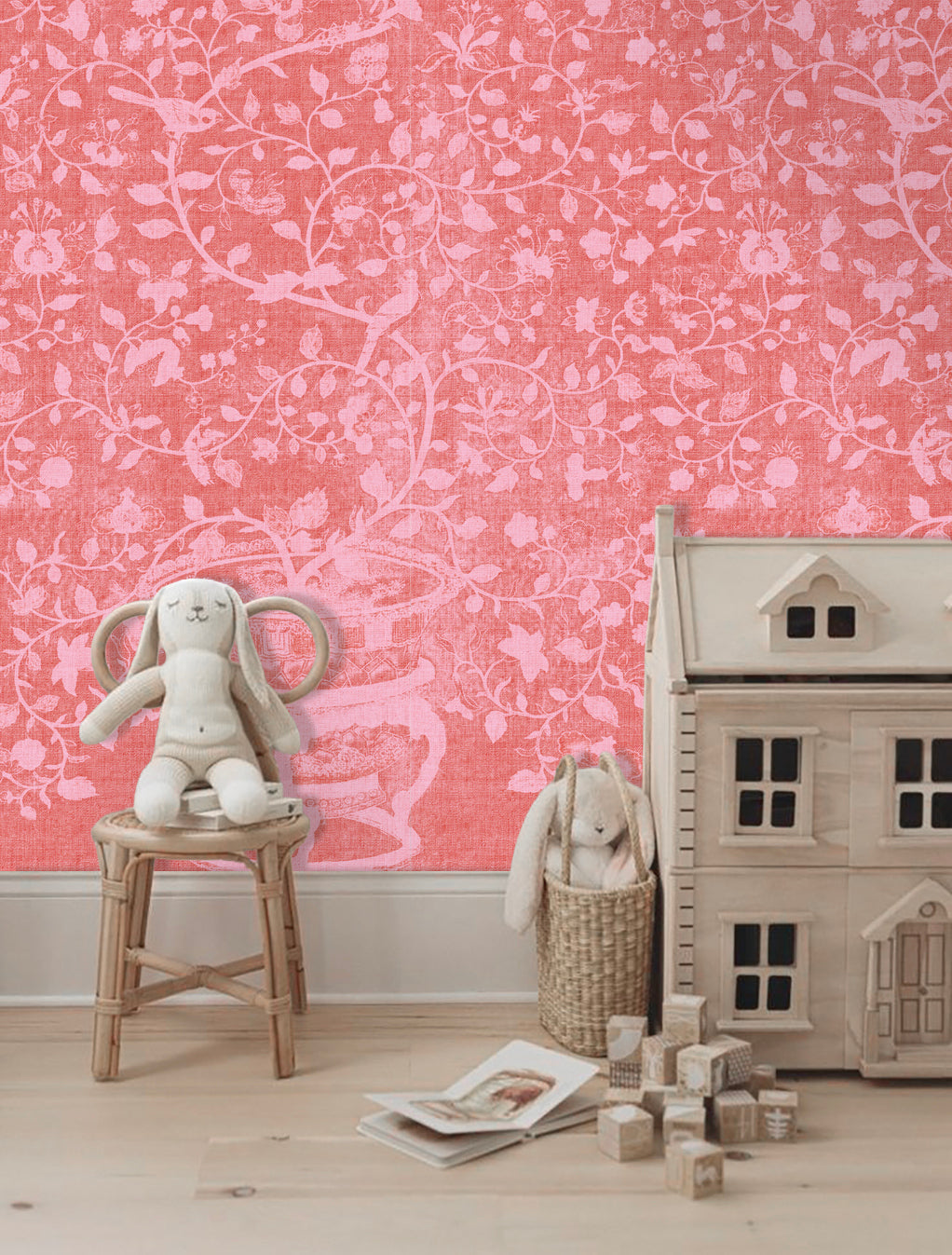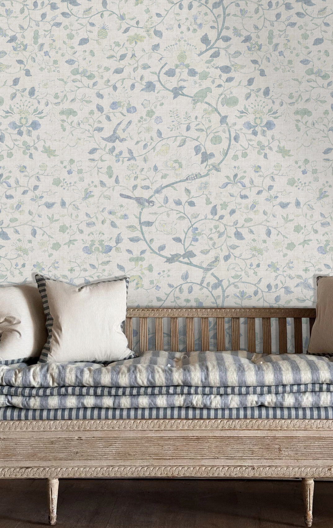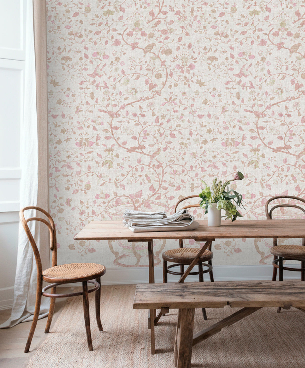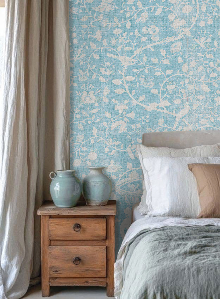 Papel mural de inspiración botánica clásica, con delicados motivos florales, aves y ramas entrelazadas sobre un fondo con textura tipo raffia. Su paleta suave y empolvada, disponible en tonos azules, verdes y rosados, aporta luz, elegancia. Ideal para livings, dormitorios y comedores donde se busca un ambiente acogedor, natural y sofisticado.
