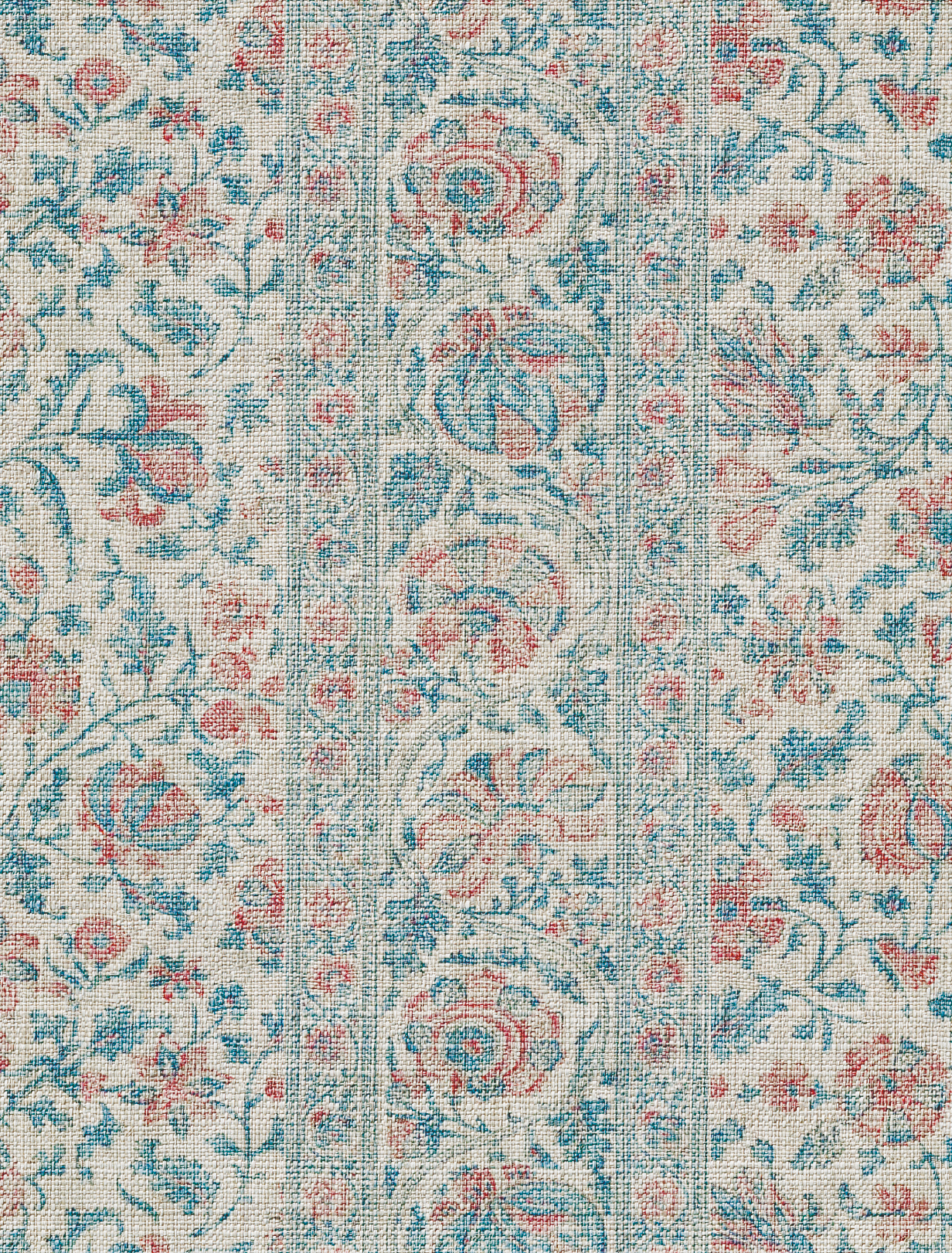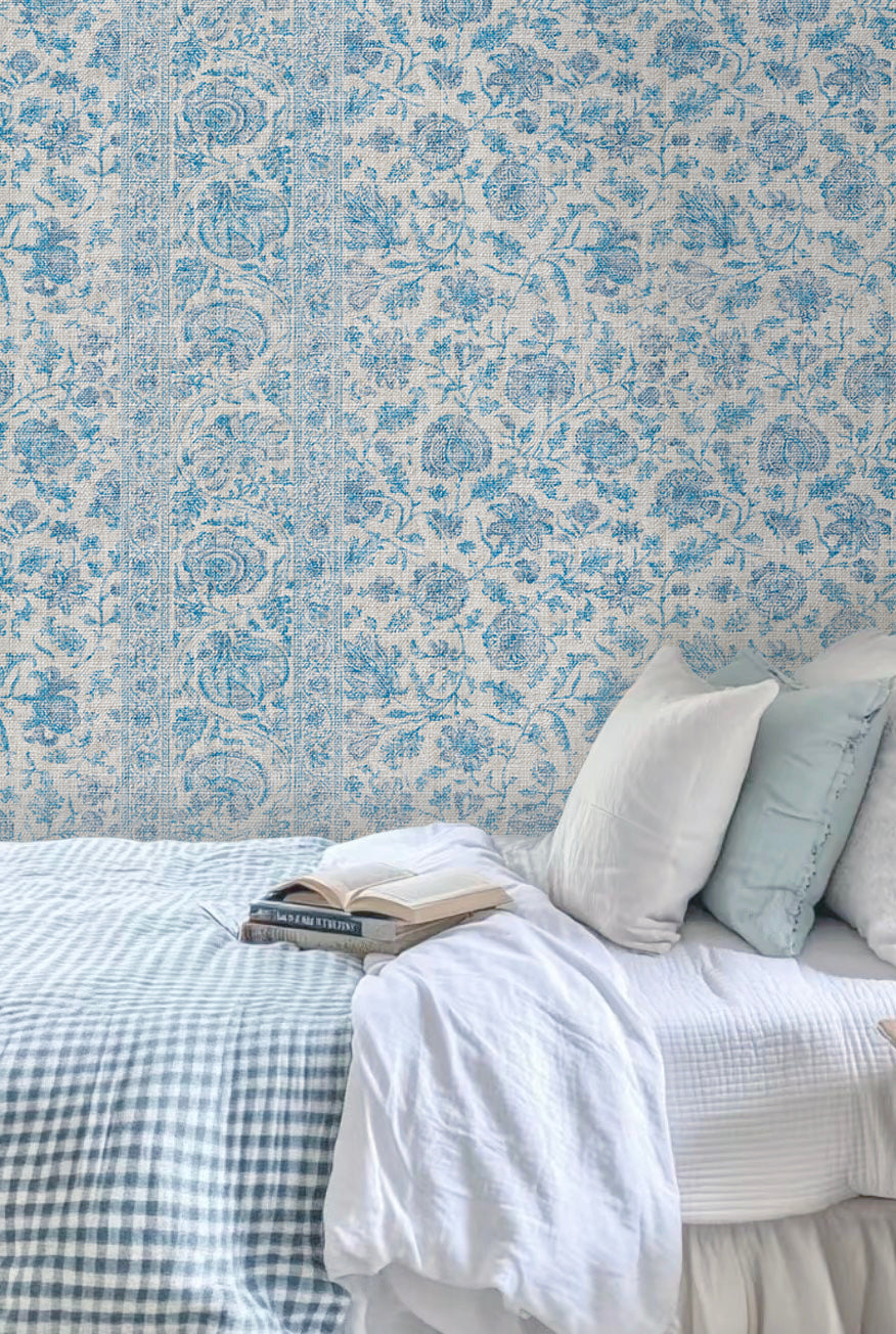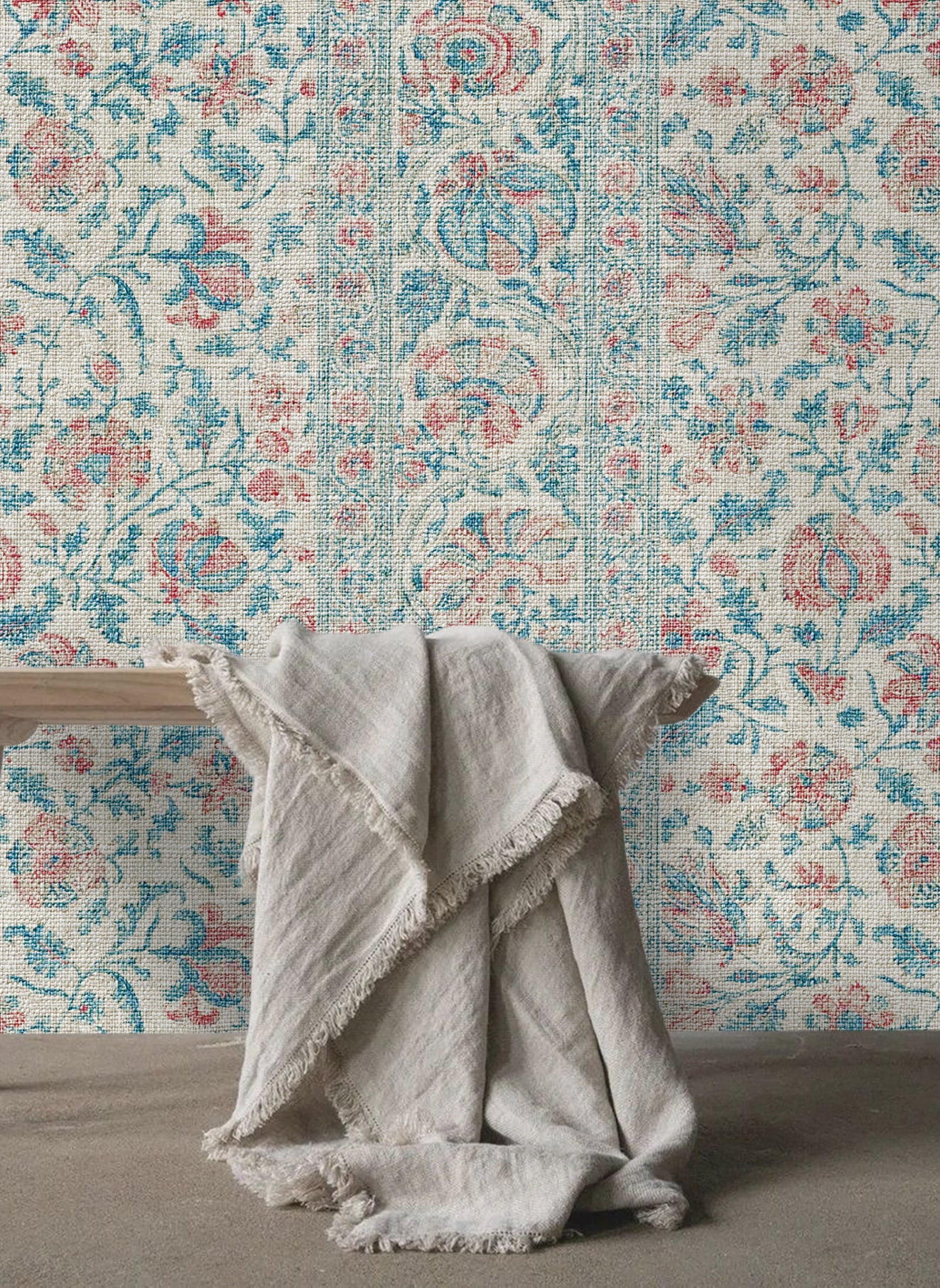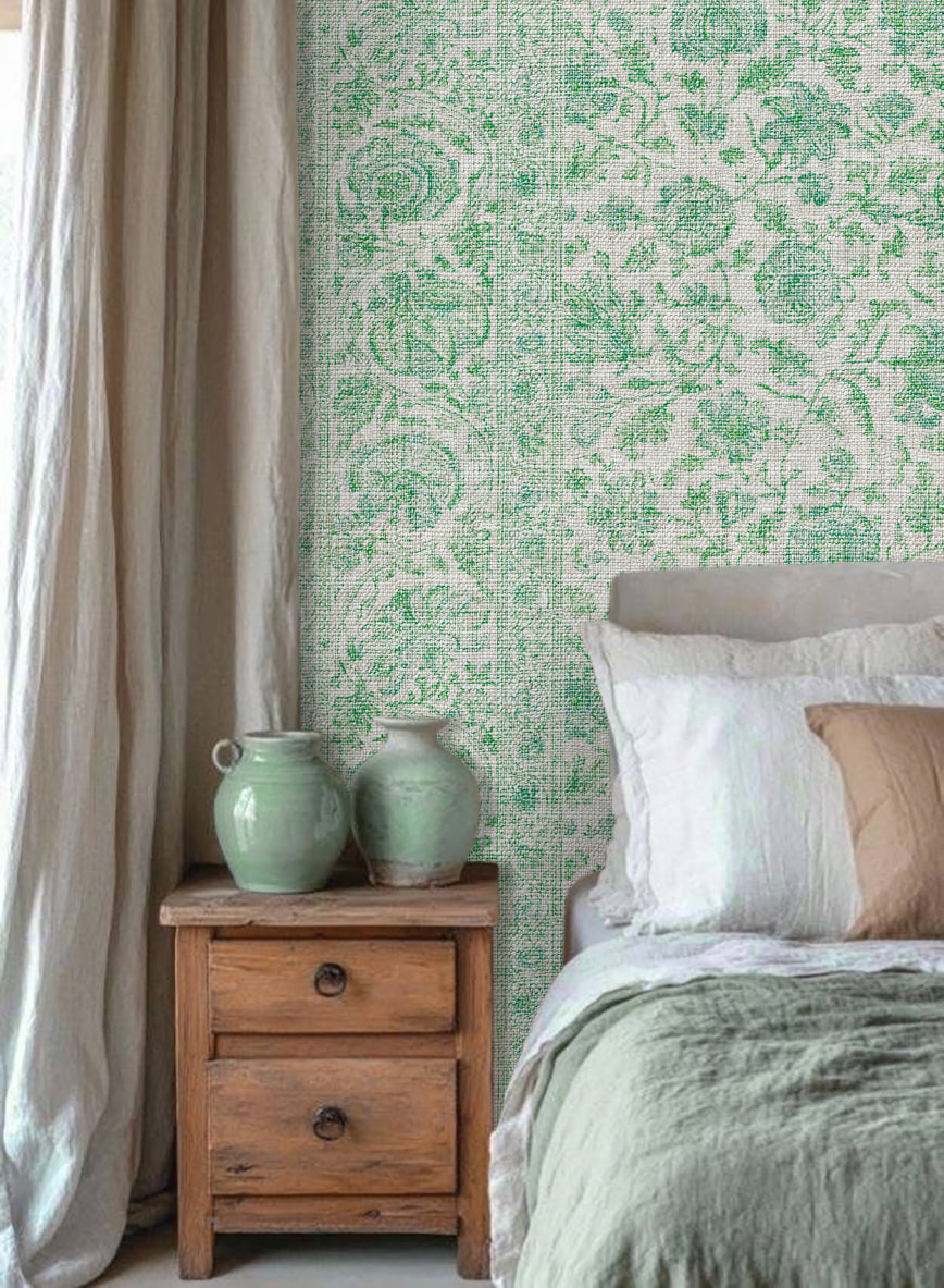 Papel floral estilo indio con textura tipo lino que aporta profundidad y un acabado natural a los muros. Disponible en suaves tonalidades verde, azul y terracota, ideal para dormitorios, salones o espacios acogedores que buscan una decoración atemporal.