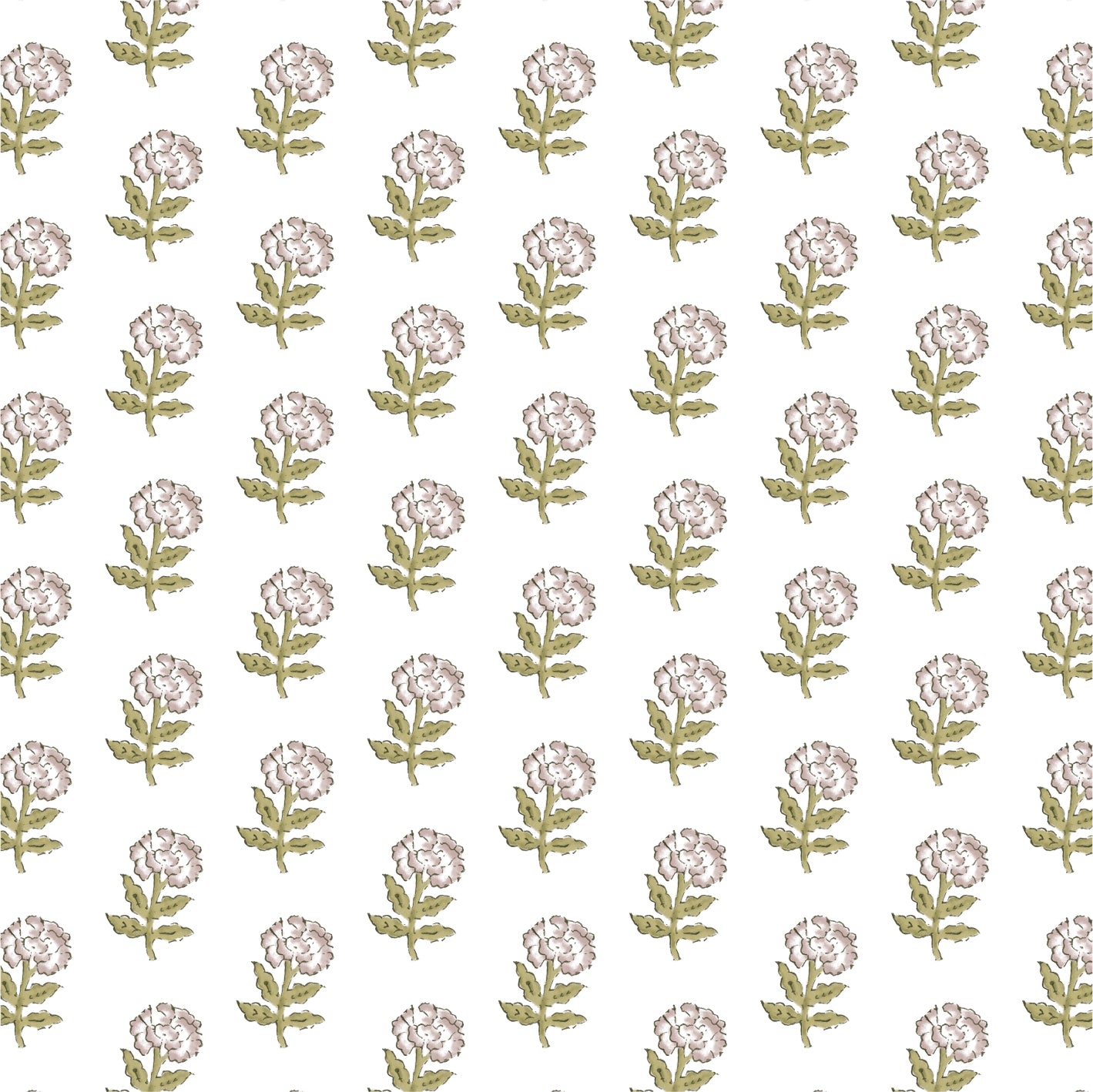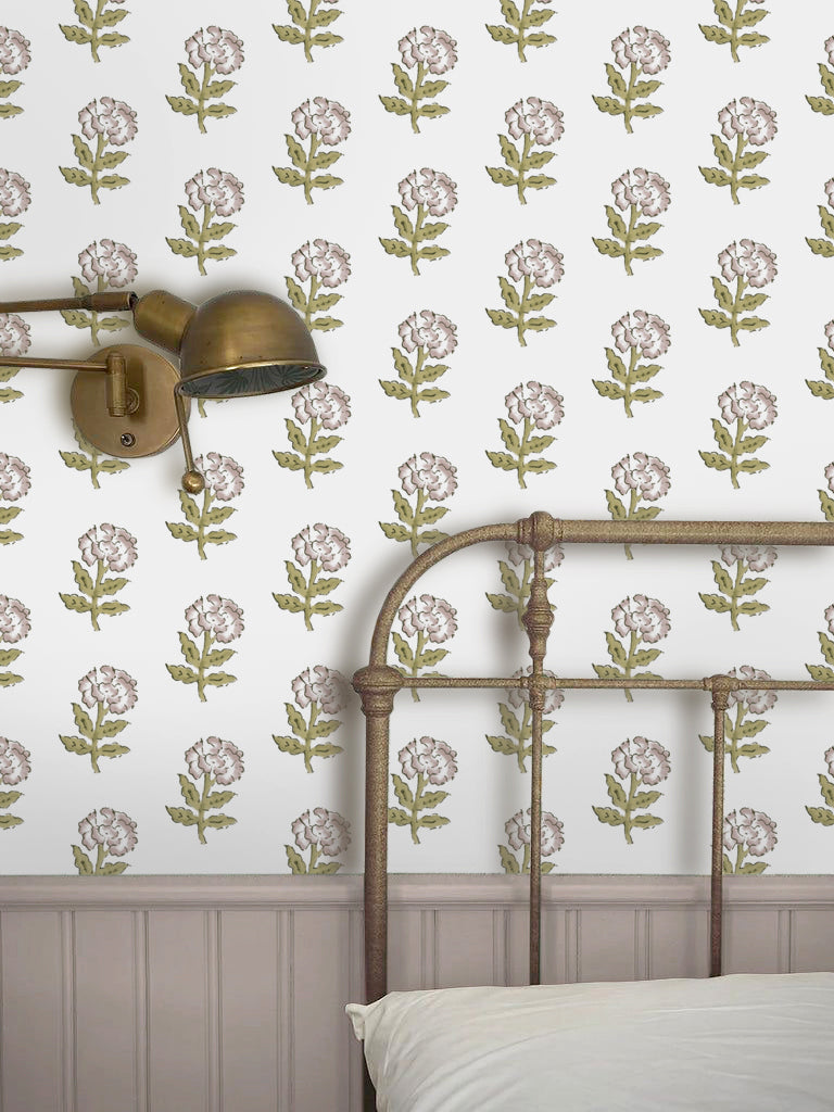 Papel mural de estilo indian pattern. Aporta calidez a cualquier dormitorio o espacio acogedor. Sus tonos suaves y diseño botánico crean una atmósfera armónica y atemporal, perfecta para ambientes románticos y luminosos.