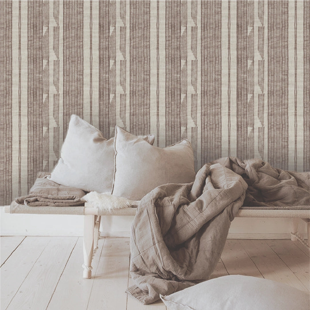 Este diseño imita la textura del telar en color crema con rayas finas y patrones geométricos en un tono topo. Es un papel pintado texturizado que le da calidez y profundidad a cualquier pared sin recargar.