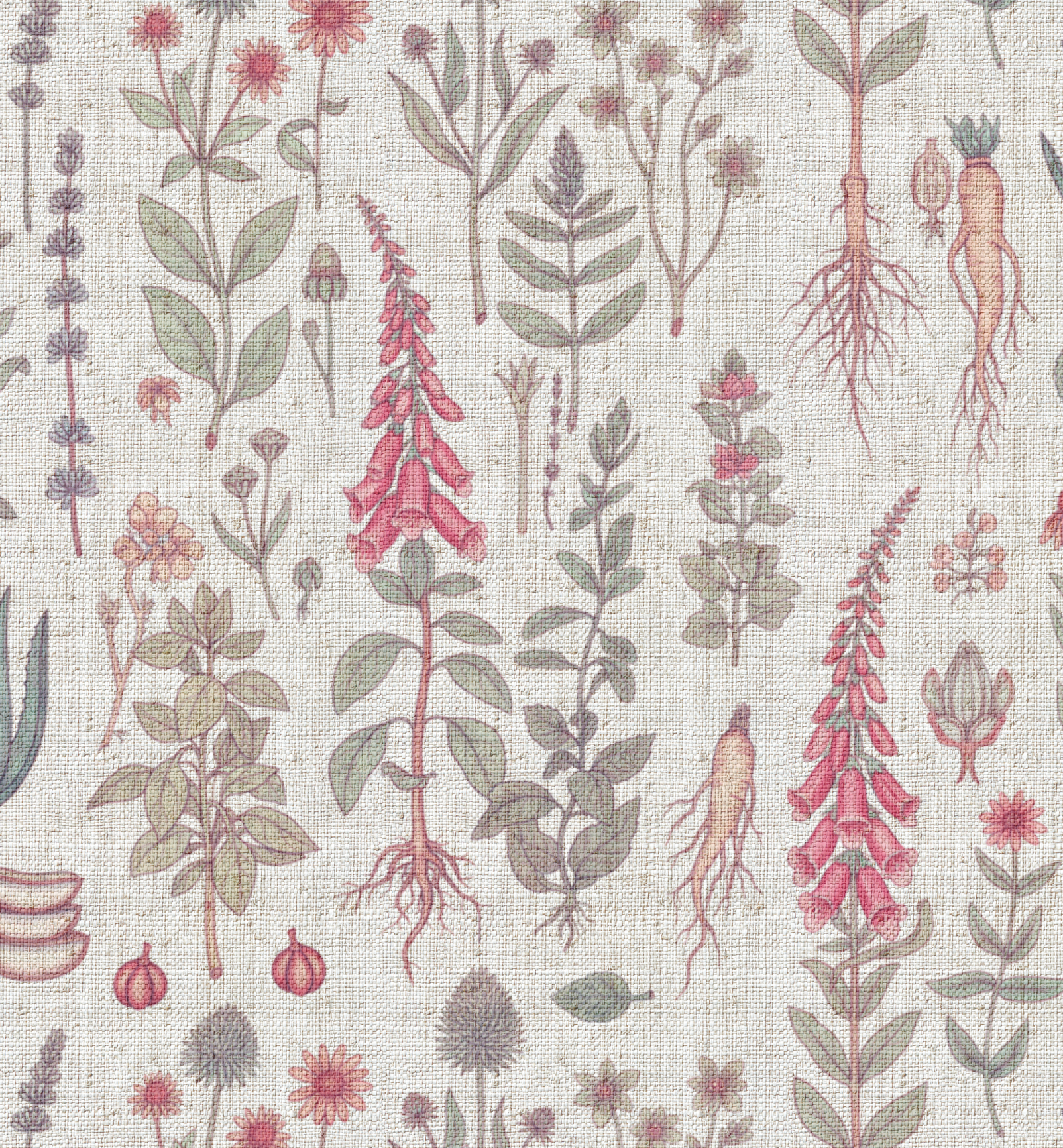 Papel mural de estilo botánico con delicadas ilustraciones de plantas, flores y raíces, inspirado en antiguos herbarios. Sus tonos suaves y naturales crean un ambiente sereno, acogedor y elegante, ideal para dormitorios, livings o espacios de descanso. Un diseño atemporal que aporta calma, naturaleza y sofisticación a los interiores.