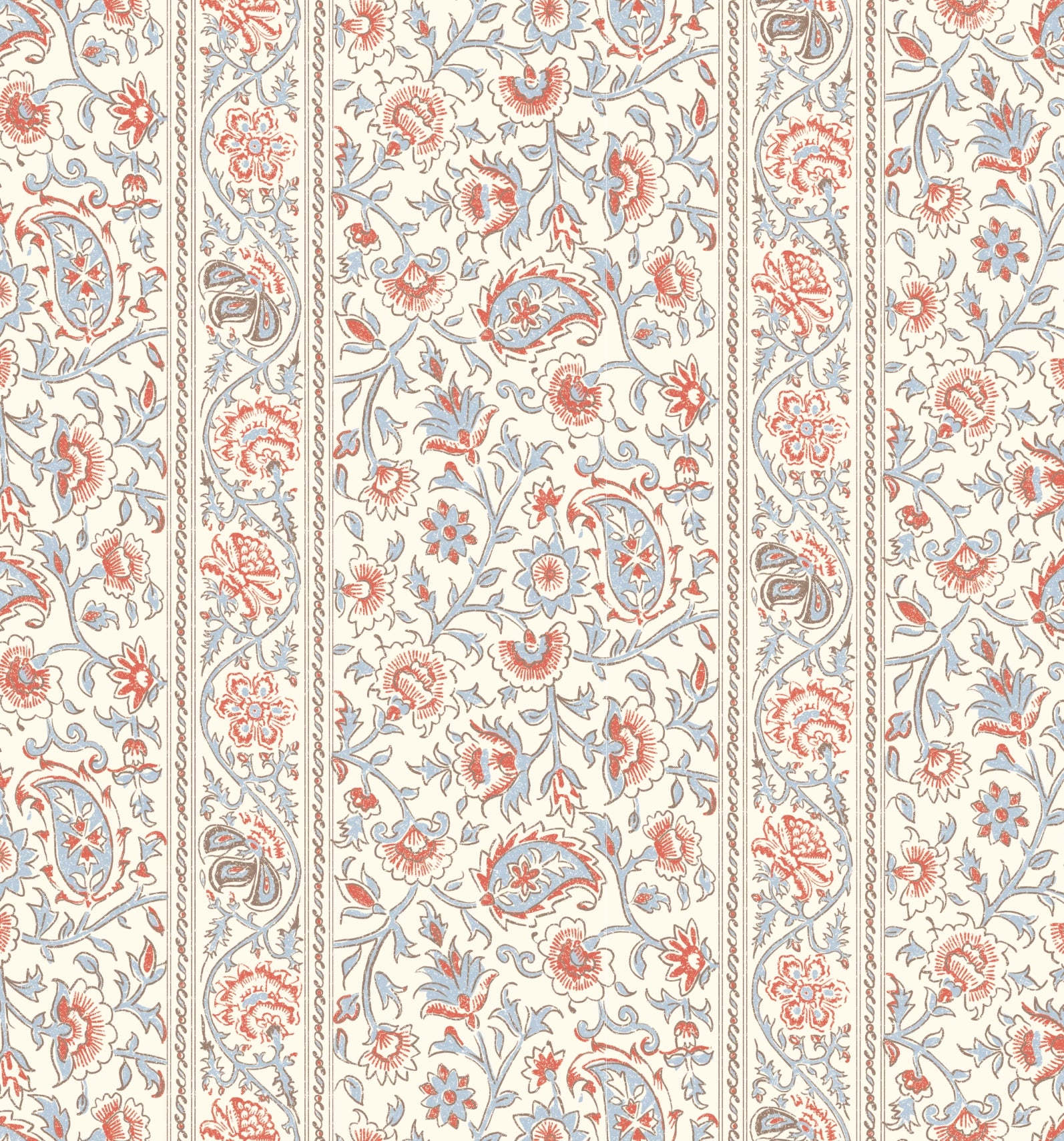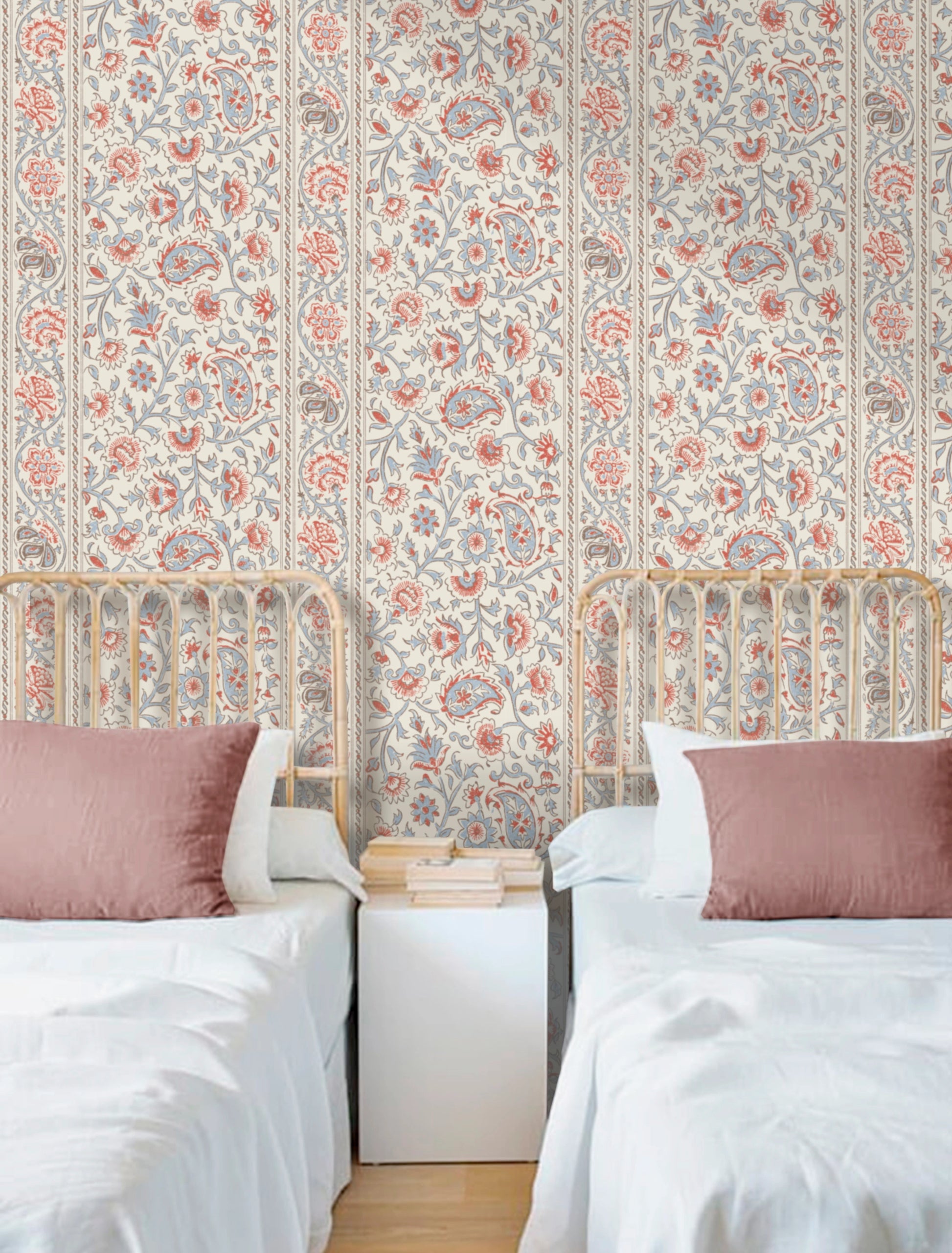 Este papel pintado a rayas presenta un patrón de flores, hojas y paisley que se inspira en el arte tradicional folk. Las ilustraciones, en tonos rojo óxido, celeste y café, resaltan sobre un fondo crema.