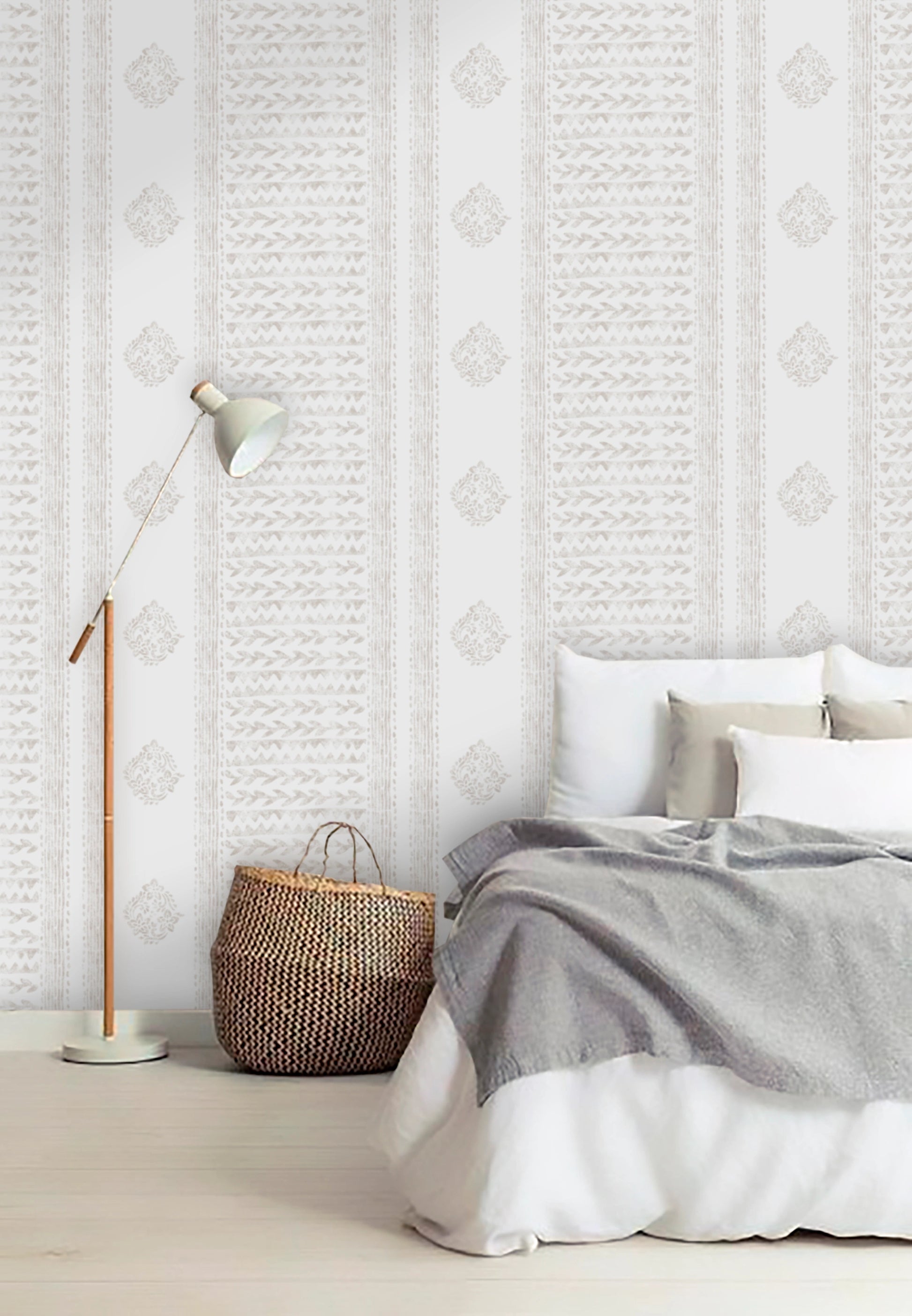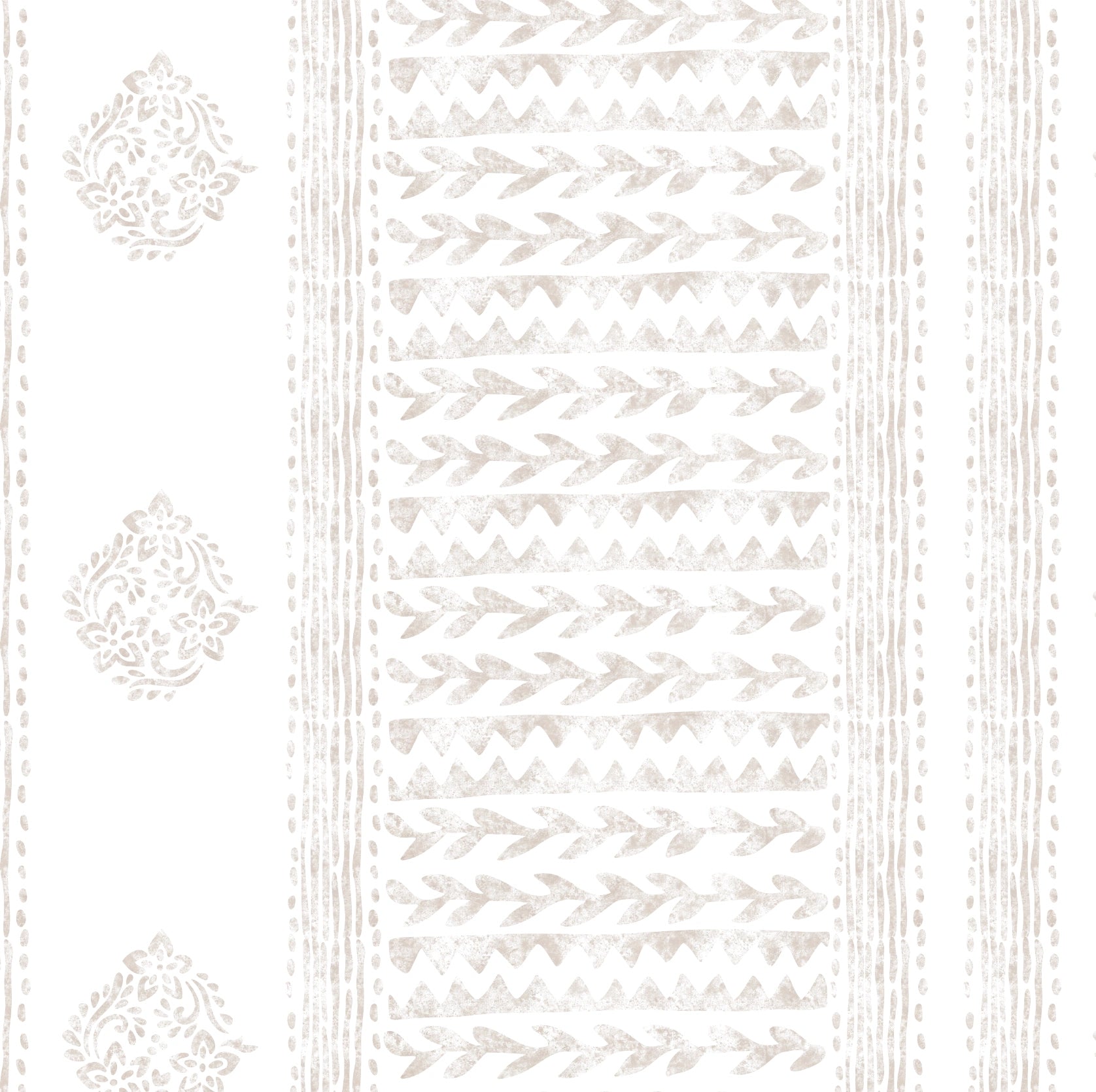 Este papel pintado a rayas presenta bandas verticales con patrones geométricos de inspiración boho, como zigzags, hojas y medallones florales. El diseño es suave y luminoso, utilizando únicamente el color beige claro sobre un fondo blanco puro.