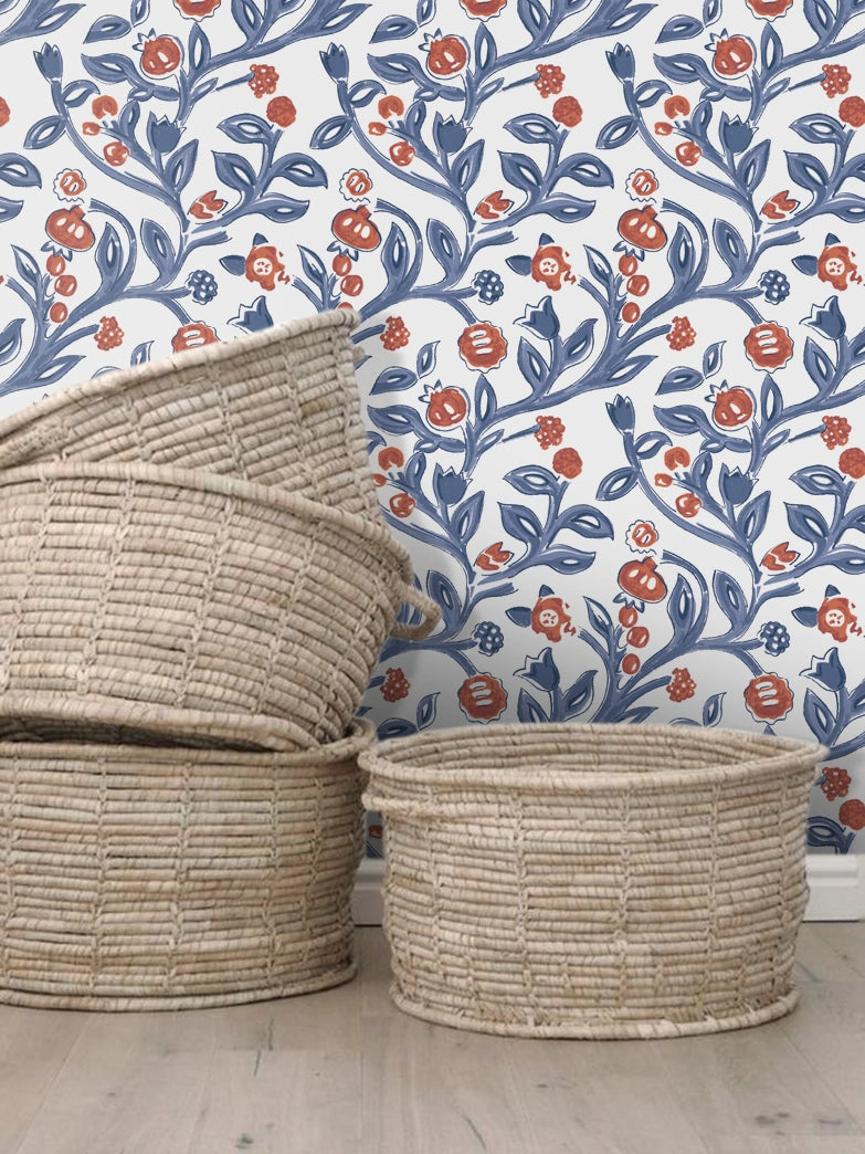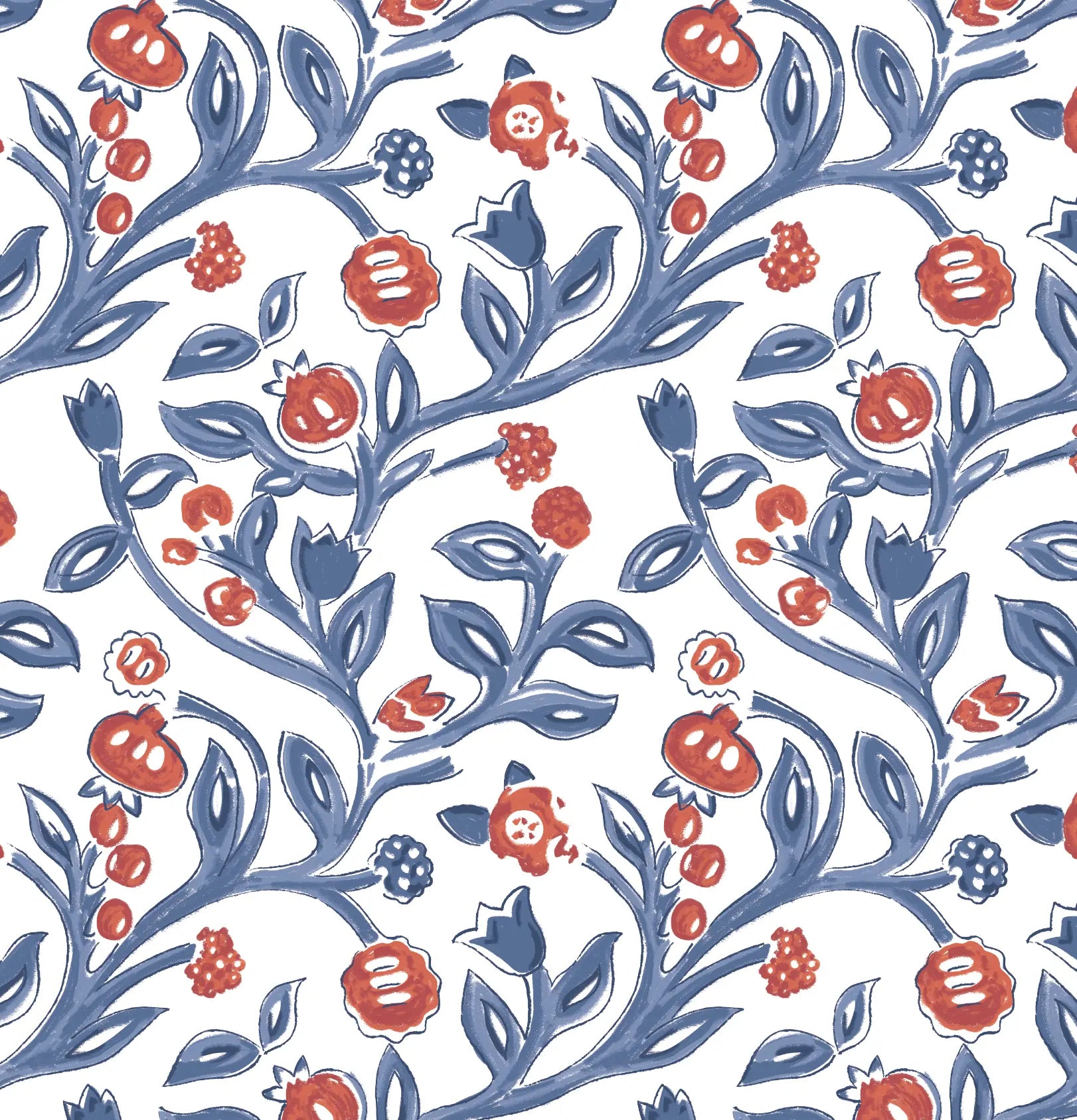 Este papel pintado floral presenta un patrón de ramas, hojas y frutos con un estilo de dibujo manual o a pinceladas que le da un aire muy fresco y juvenil. La combinación de azul índigo y rojo anaranjado sobre un fondo blanco crea un contraste vibrante y muy llamativo.