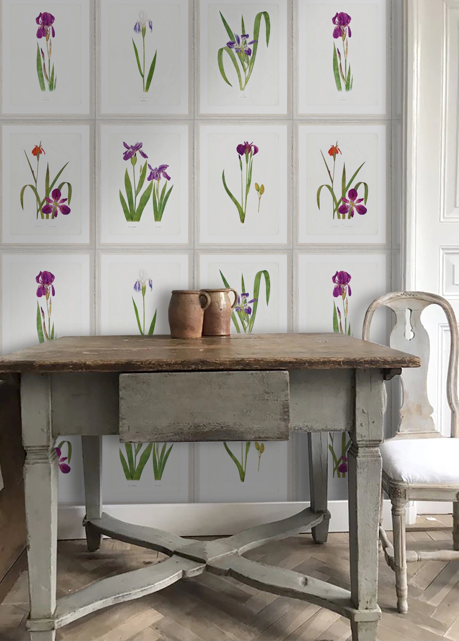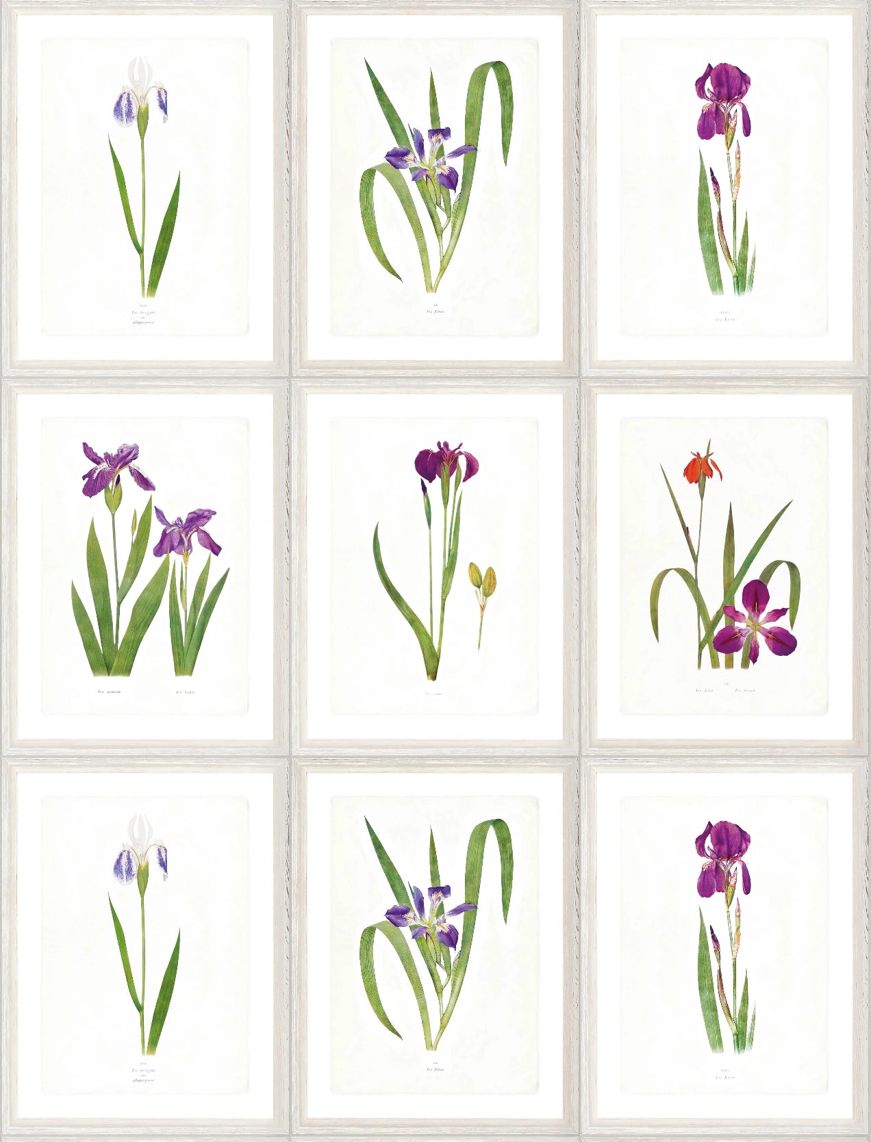Este papel pintado simula un conjunto de nueve cuadros de láminas botánicas clásicas, cada uno con un marco de madera envejecida. Las ilustraciones de lirios en acuarela, sobre un fondo blanco, aportan un estilo clásico y lleno de color.