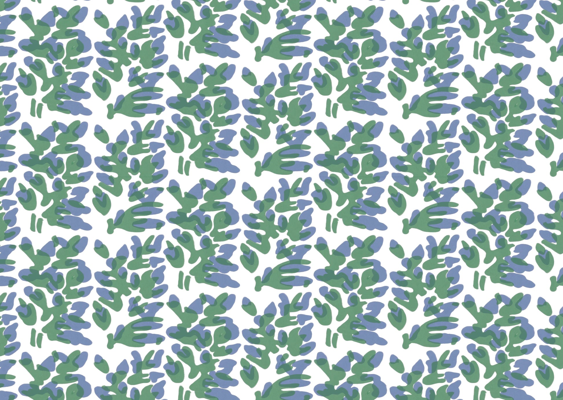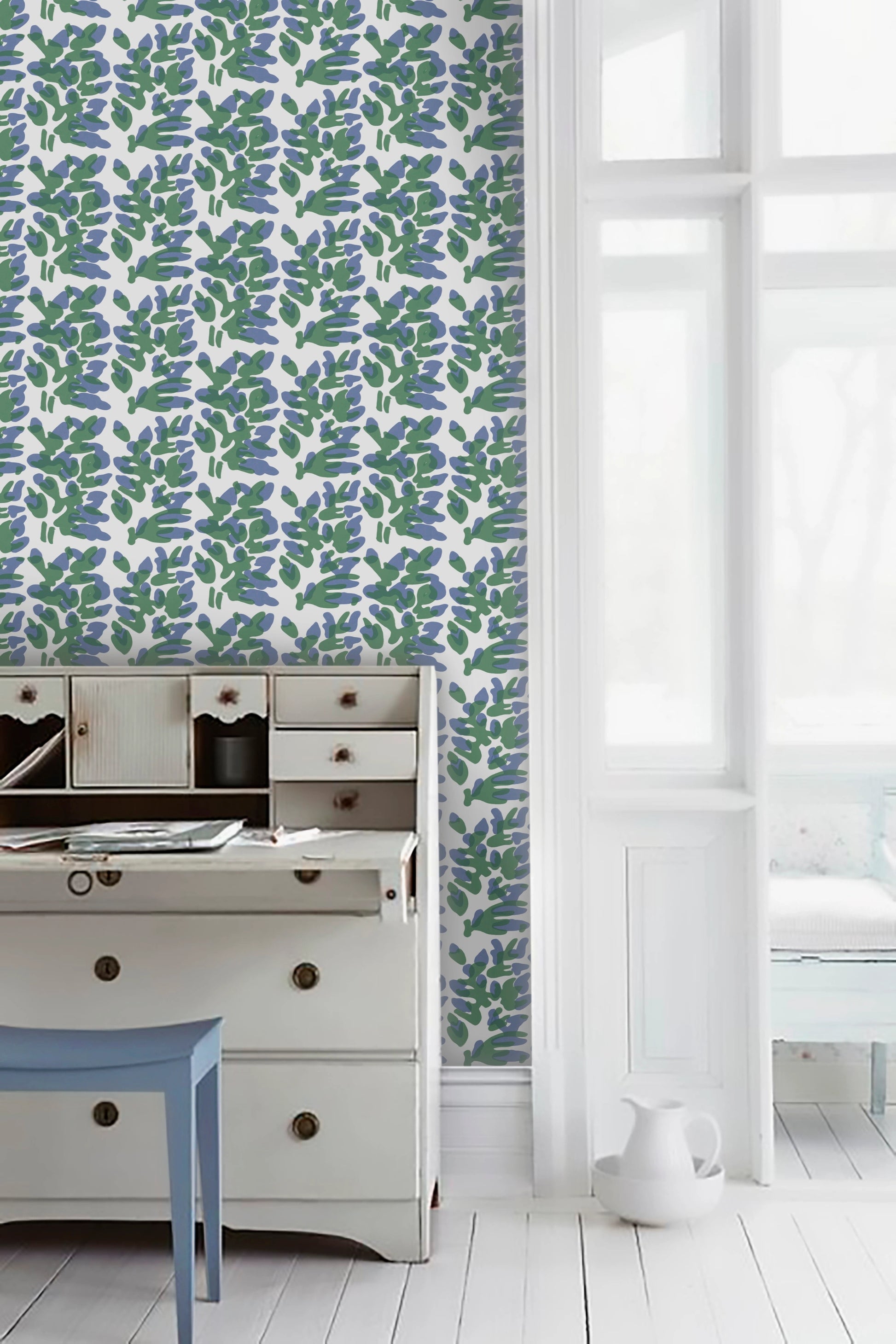 Este papel pintado presenta un patrón de follaje denso con un estilo de pinceladas gruesas. La mezcla de verde esmeralda y azul lavanda sobre un fondo blanco crea un contraste vibrante y lleno de movimiento.