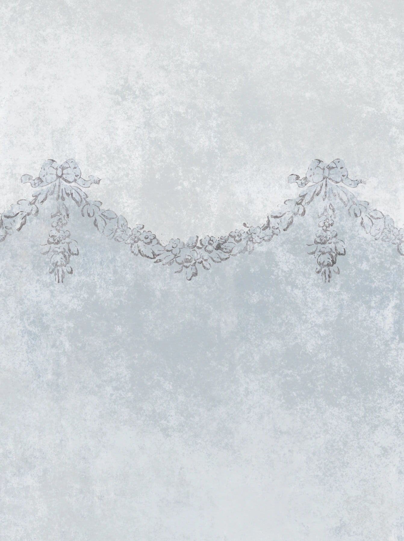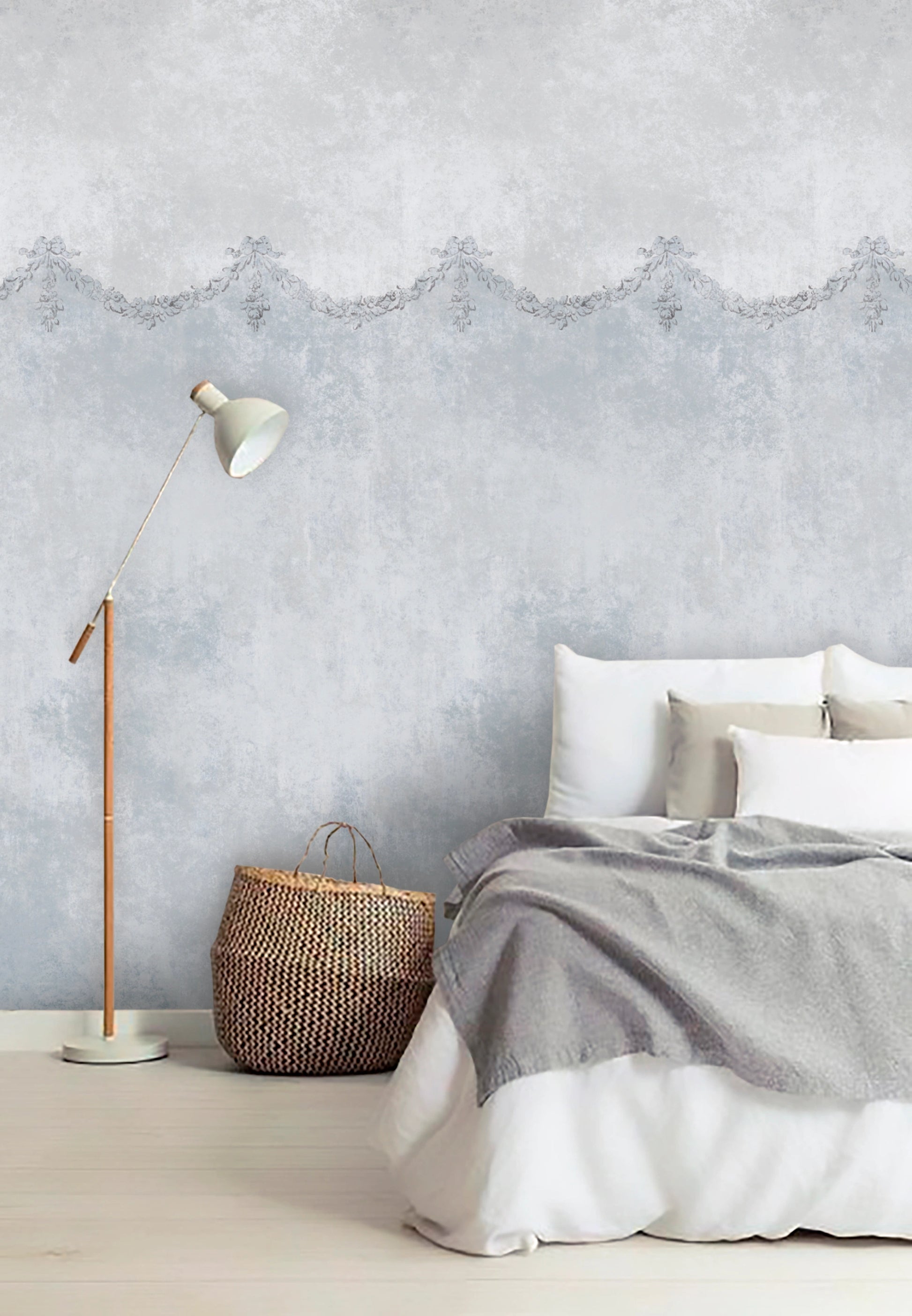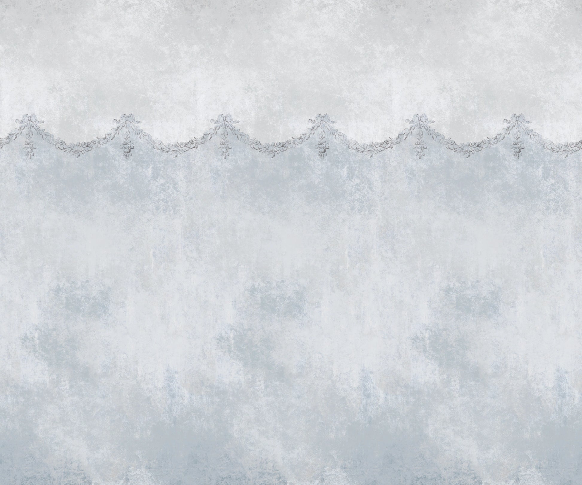 Este papel pintado presenta un fondo texturizado con efecto de desgaste, en una paleta muy tranquila de gris y azul claro. El diseño destaca por su cenefa con motivos clásicos que actúa como transición entre dos tonos.