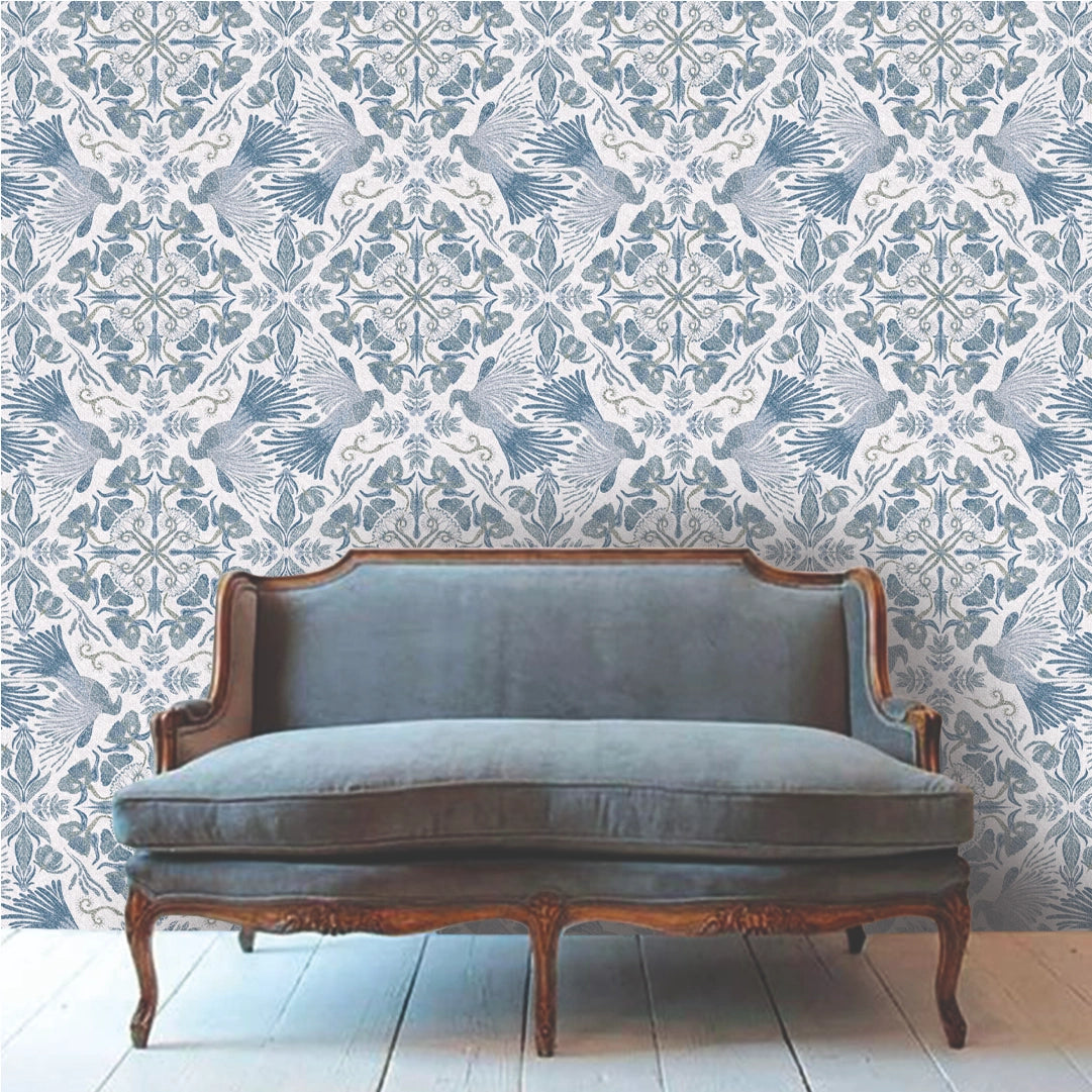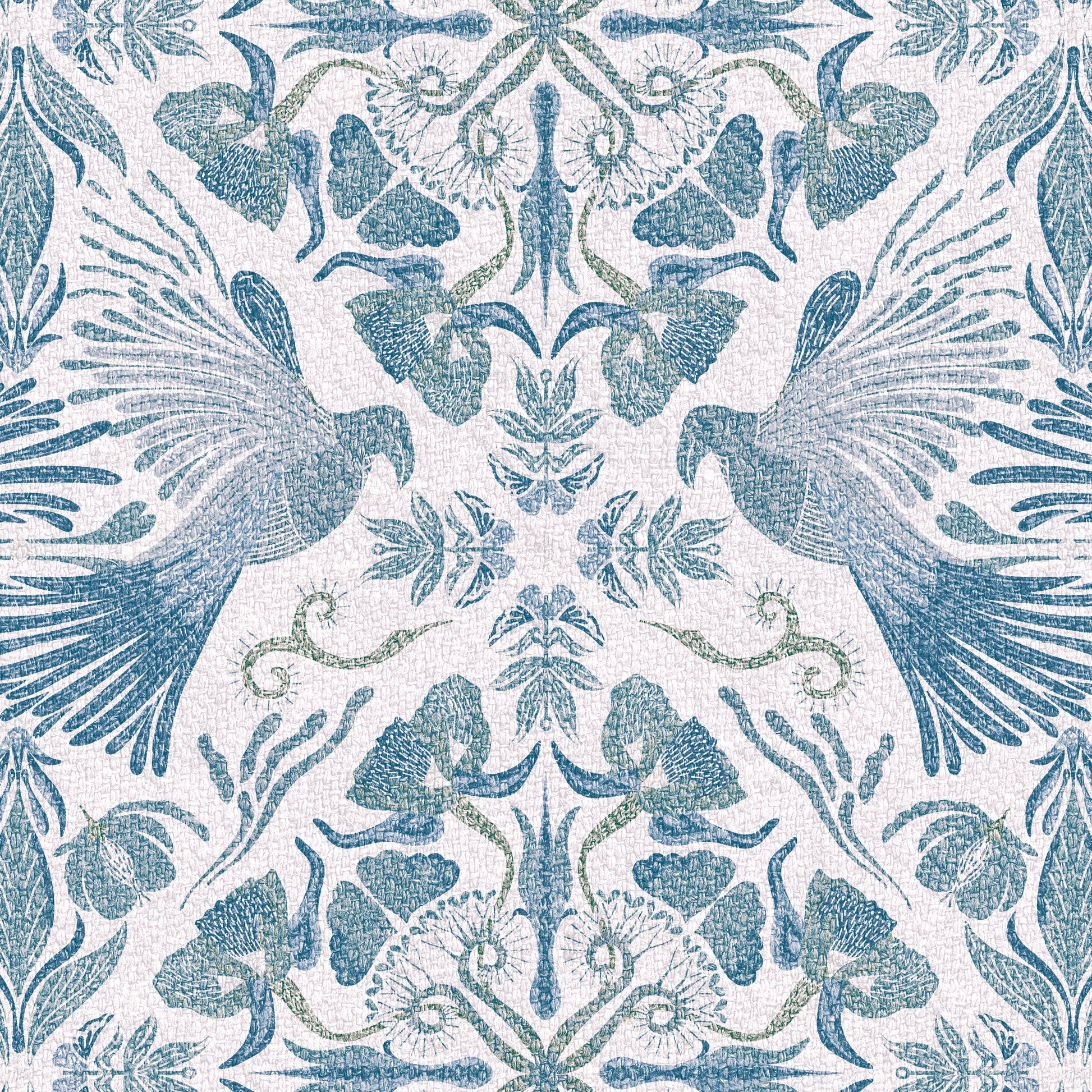 Este papel pintado presenta un complejo patrón simétrico que incluye aves majestuosas, y follaje exuberante. Los detalles intrincados, con apariencia de bordado, se muestran en una paleta de azules y verdes sobre un fondo de lino claro.