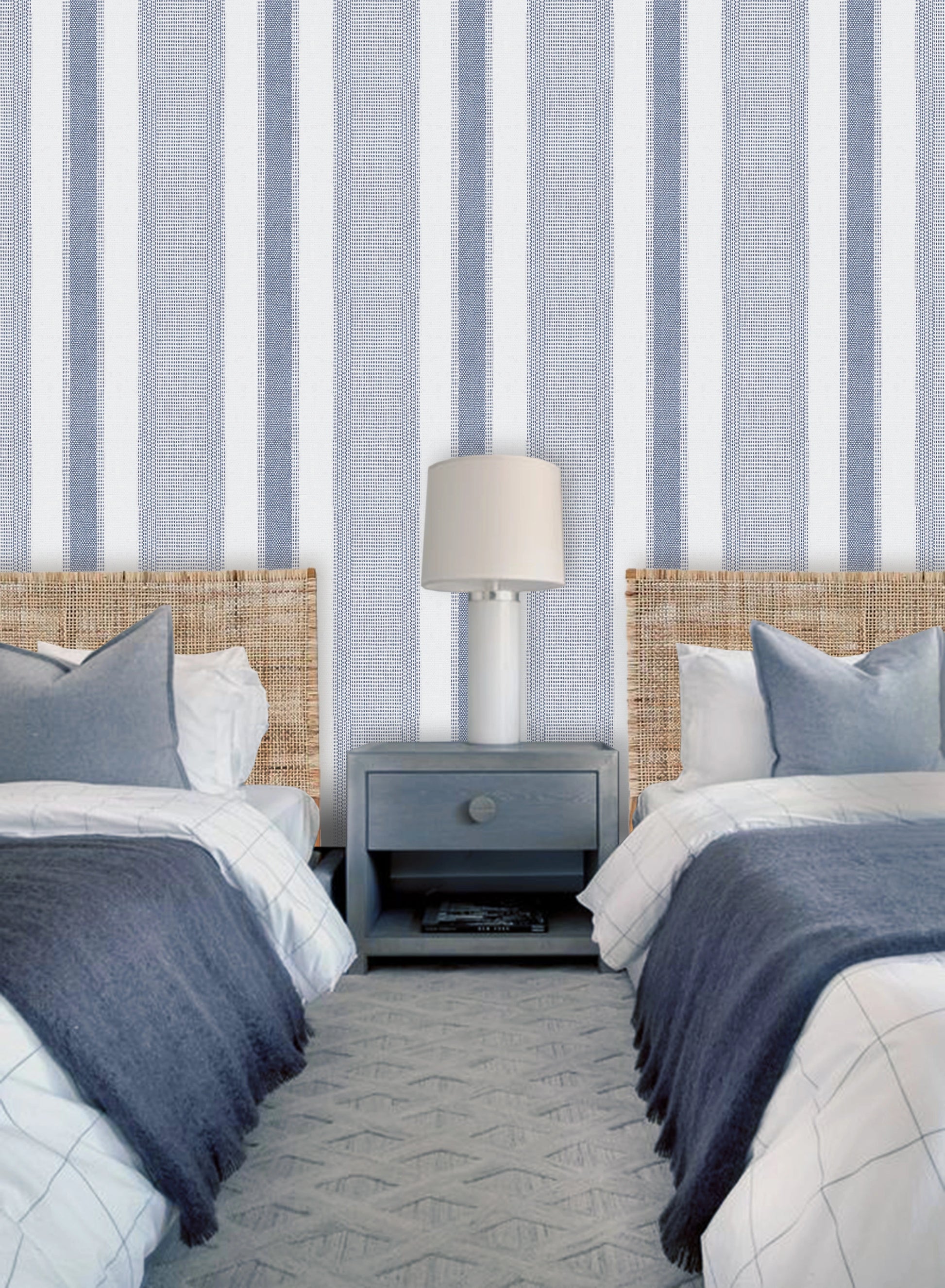 Papel para empapelar con un toque costero, clásico o moderno cualquier habitación. Su diseño vertical ayuda a alargar visualmente la pared, funcionando muy bien en dormitorios, baños o entradas.