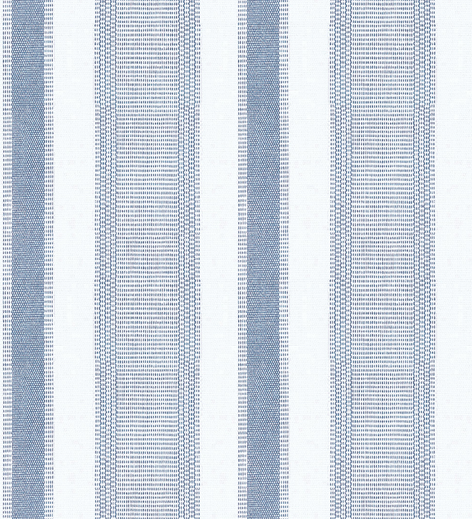Este papel pintado a rayas presenta bandas verticales en azul claro sobre un fondo blanco. El patrón imita la textura del tejido de lino, con algunas rayas más gruesas y otras formadas por sutiles líneas punteadas.