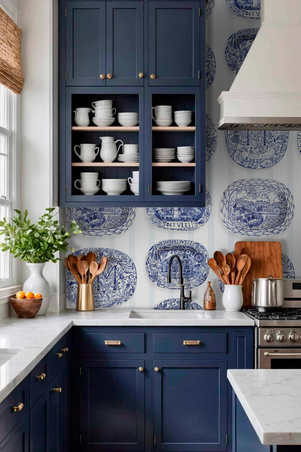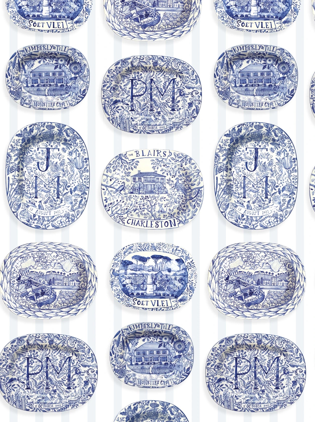 Este papel pintado a rayas rompe el molde con un diseño que simula una colección de platos de porcelana. Cada uno dibujado en el clásico azul delft sobre un fondo de rayas celestes y blancas, presenta detalladas escenas campestres, monogramas e inscripciones.