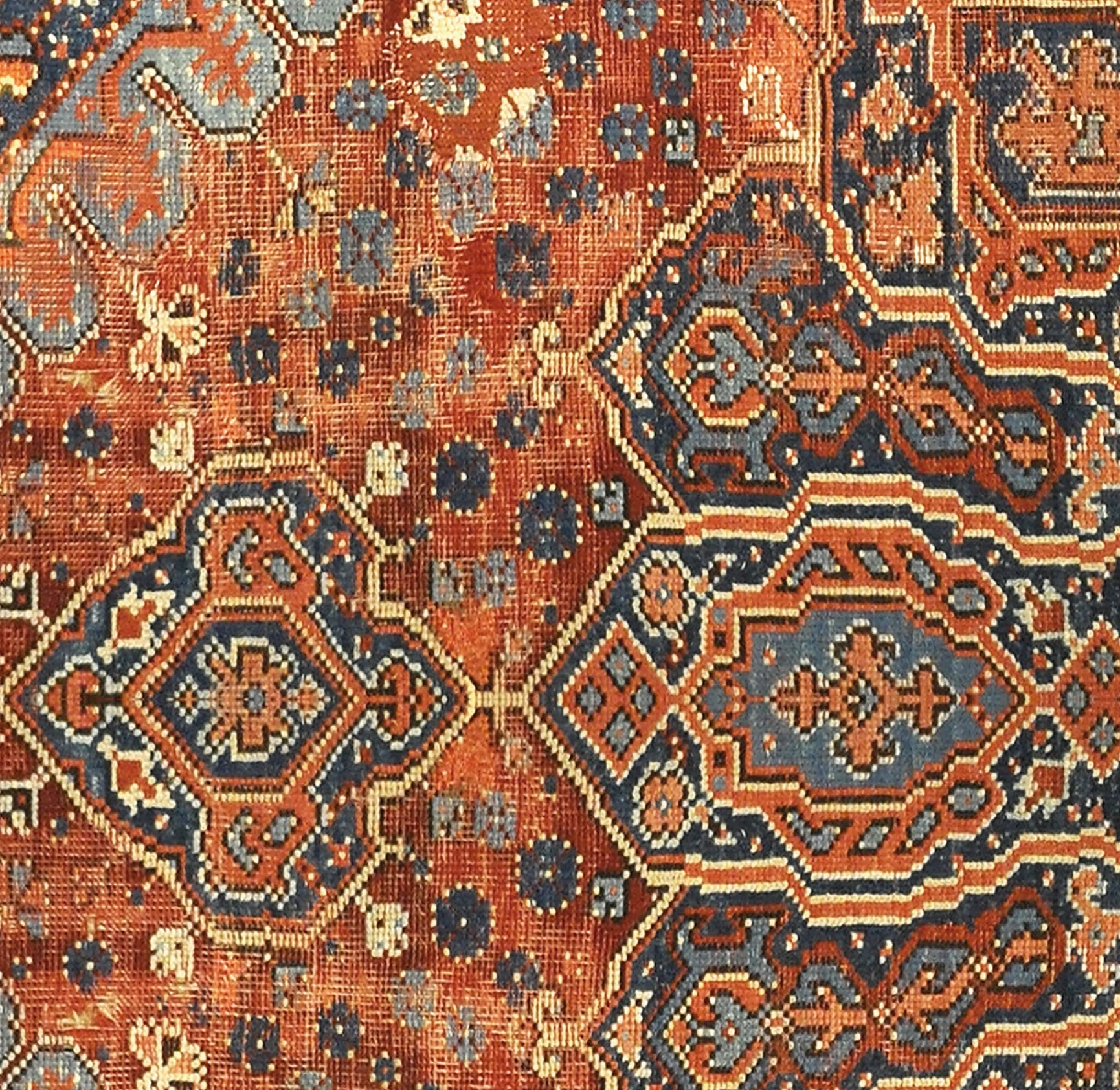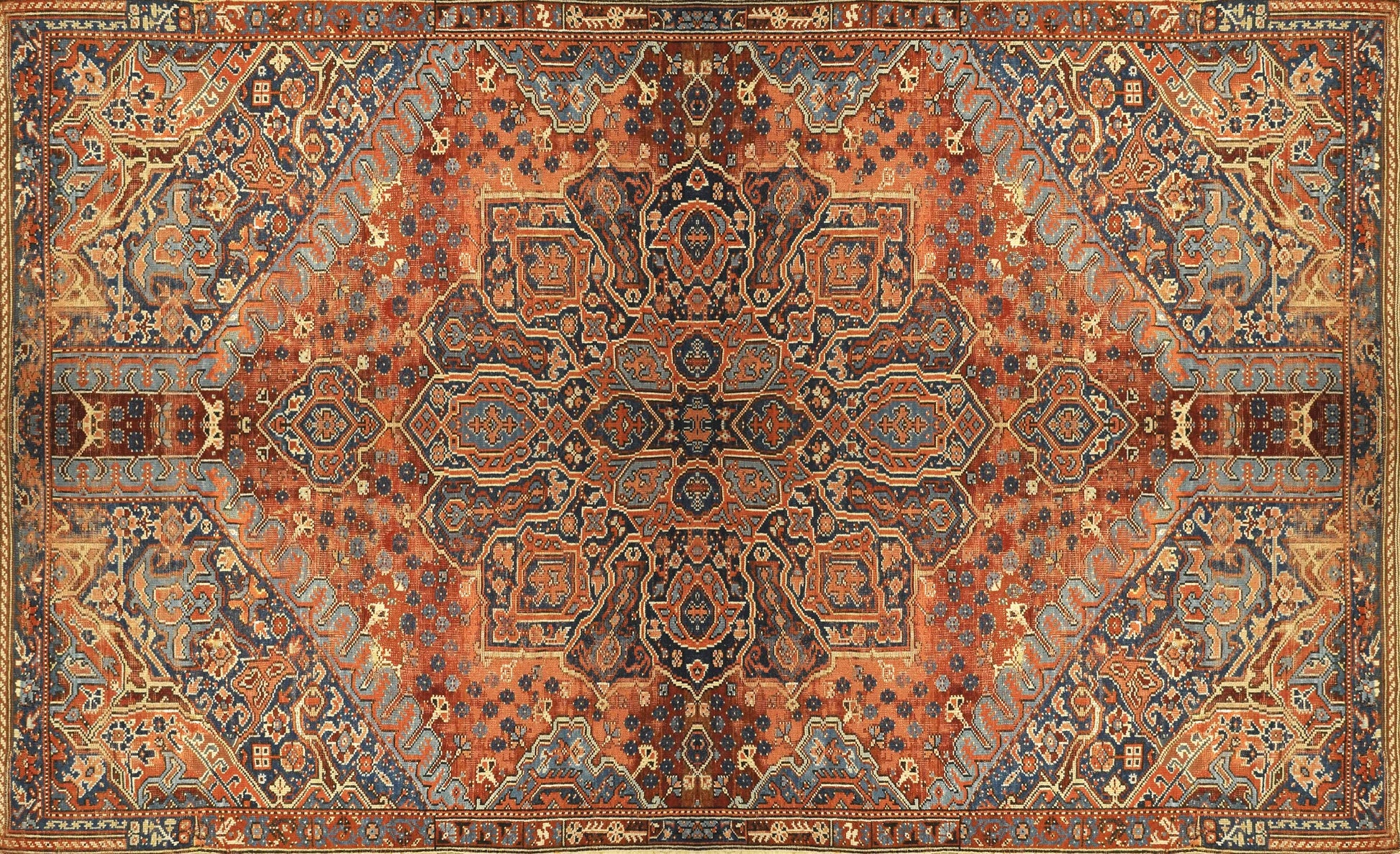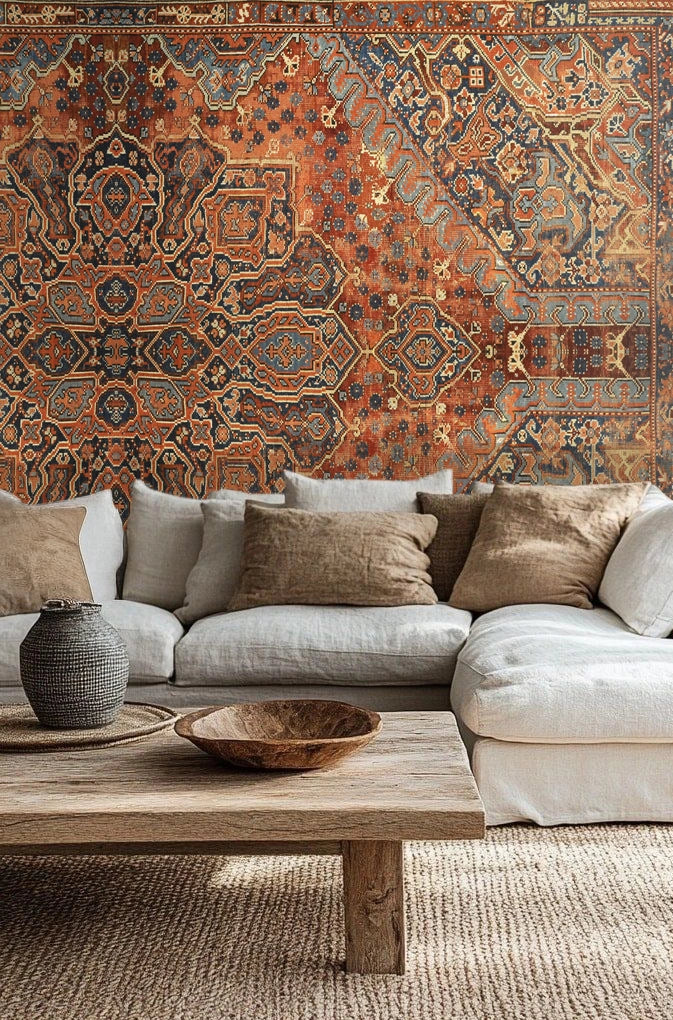 Este papel pintado de muro a muro reproduce el diseño y los colores de una alfombra persa. El diseño simétrico está lleno de patrones geométricos en tonos terracota, azul marino y beige.