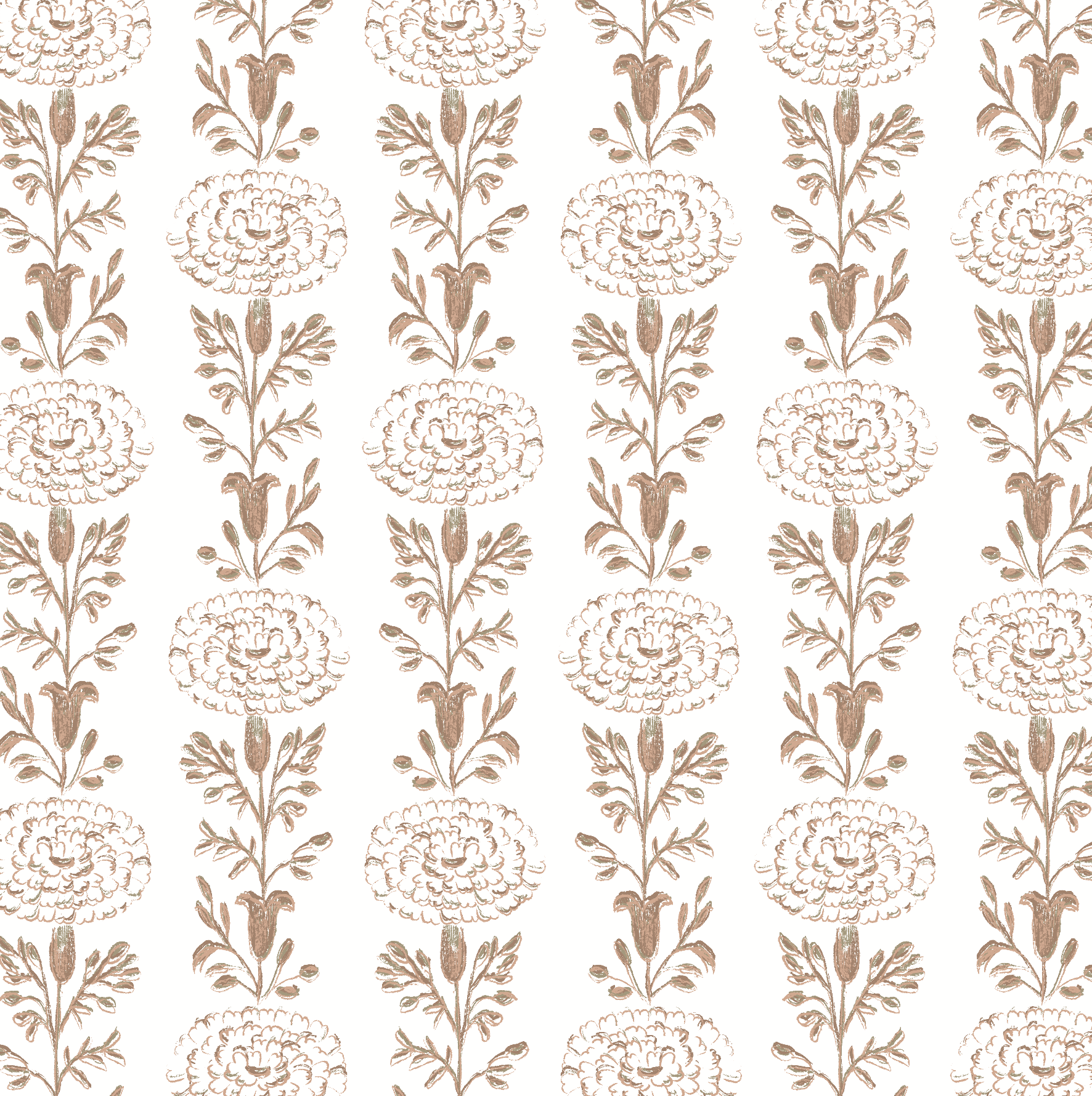 El patrón utiliza una paleta monocromática de taupe sobre un fondo blanco nítido, creando un contraste suave que aporta textura visual y luminosidad sin sobrecargar el espacio.