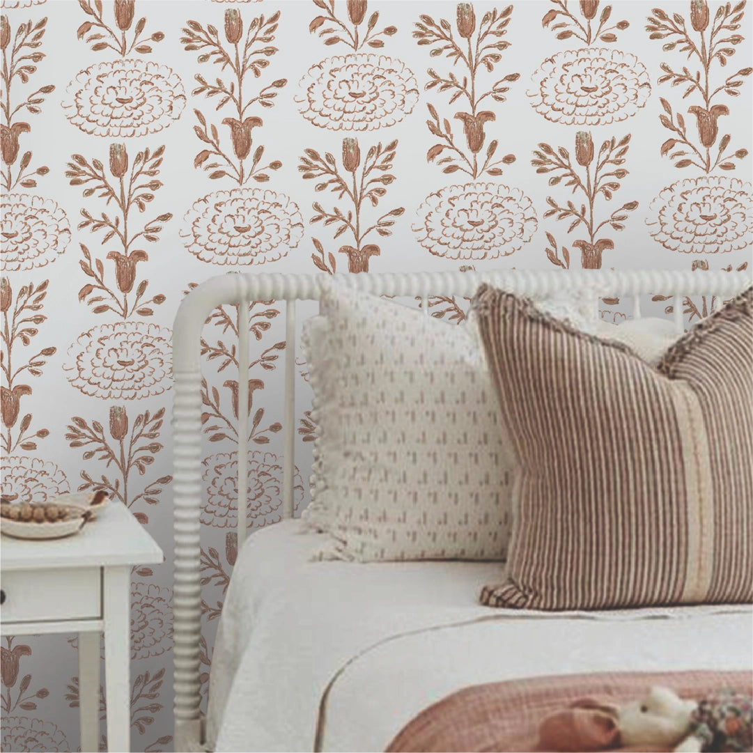 El papel mural Sara es un diseño botánico. Presenta columnas verticales de flores pomposas y tallos estilizados dibujados a mano, evocando el encanto de un boceto a lápiz.