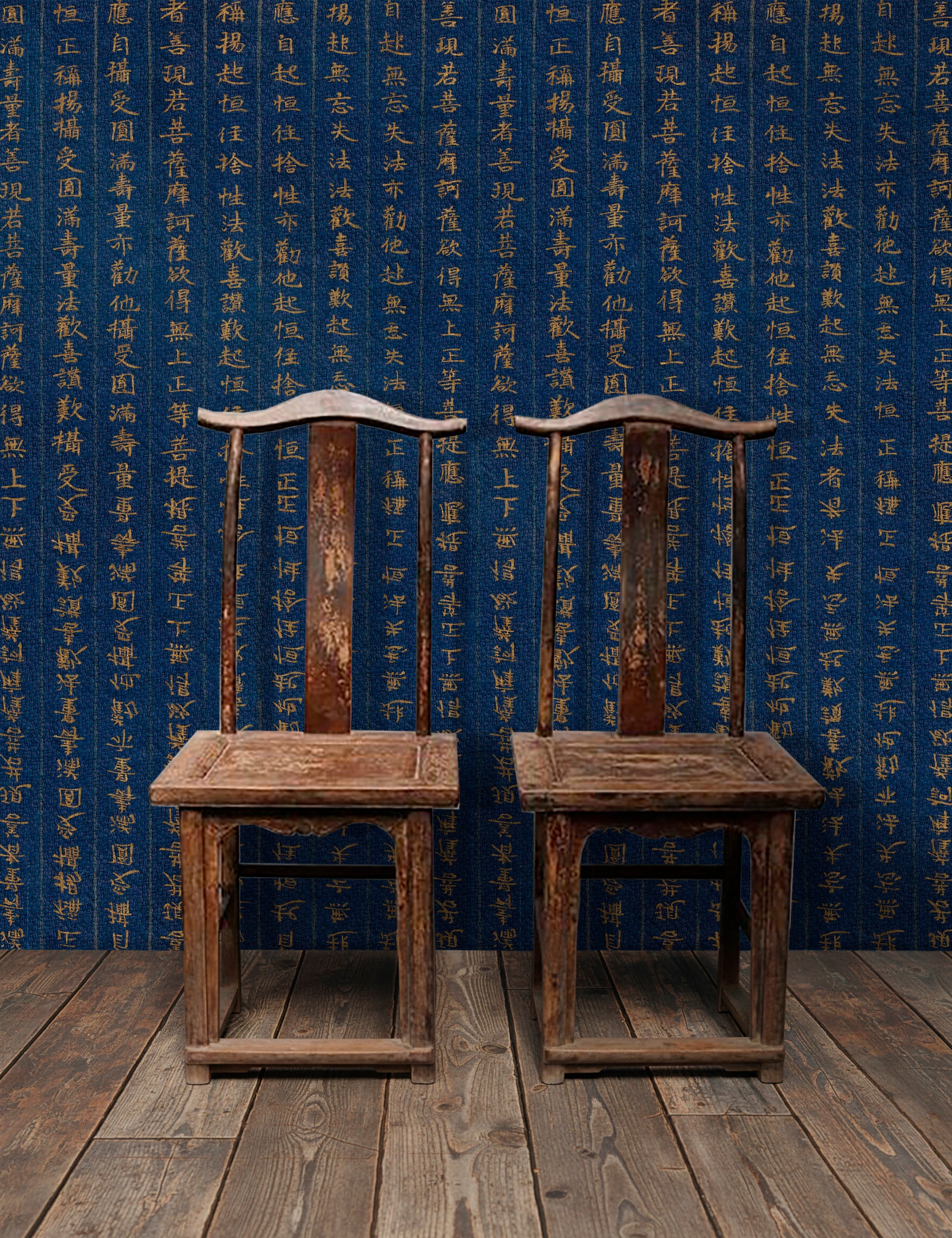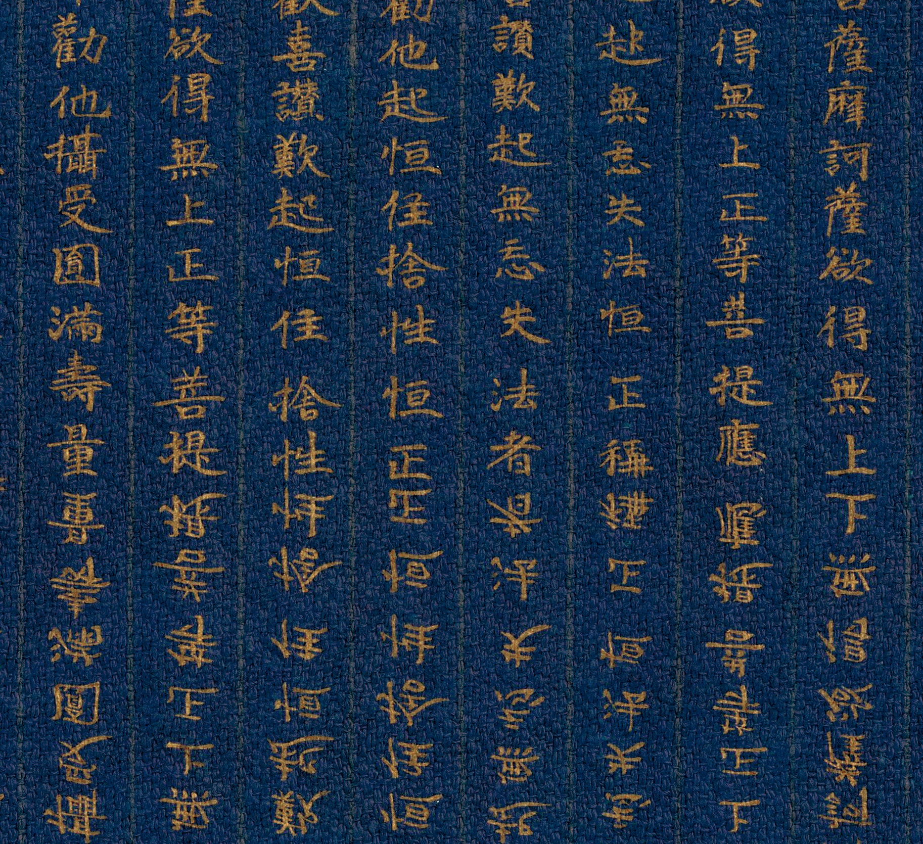 El diseño es visualmente impactante, con caracteres escritos en oro pálido y texturizado índigo. La riqueza de color y el detalle artesanal dan una textura visual increíble, transformando la pared en una obra de arte.
