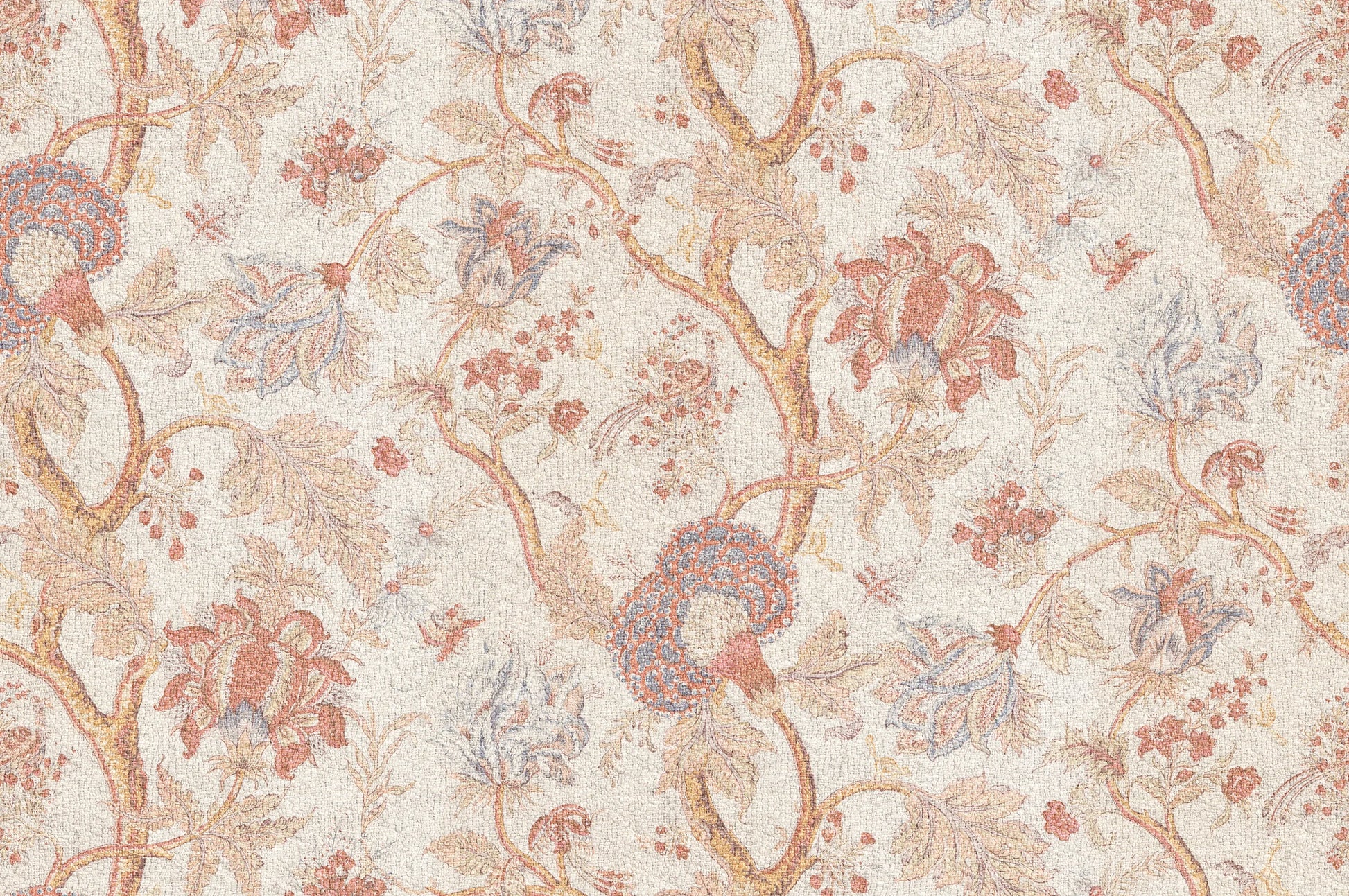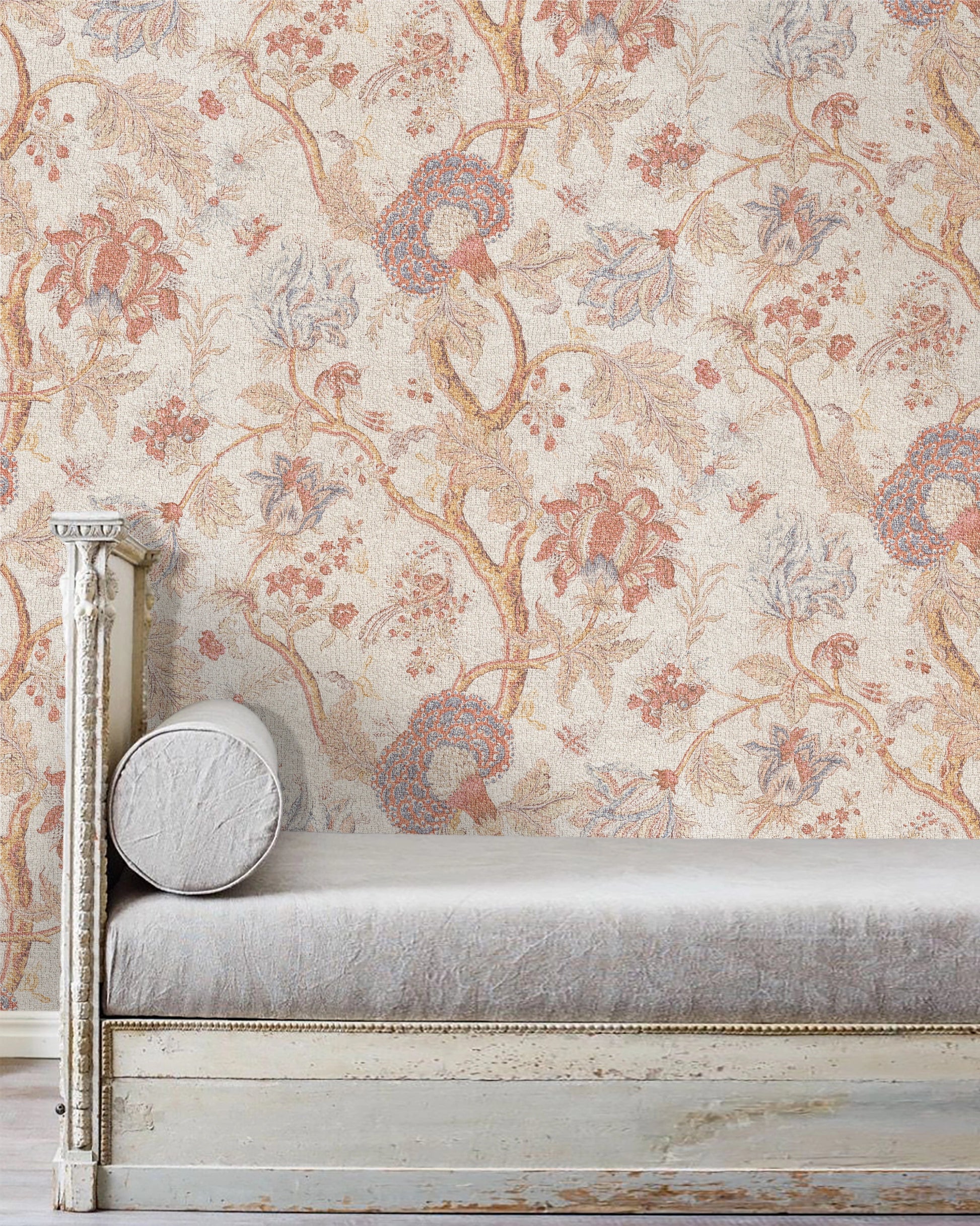 Lo lindo está en su textura que simula, que imita el aspecto de una rica tela de tapicería, dándole profundidad a la pared. La paleta es cálida y sofisticada, mezclando tonos de óxido, celeste y beige rosado.
